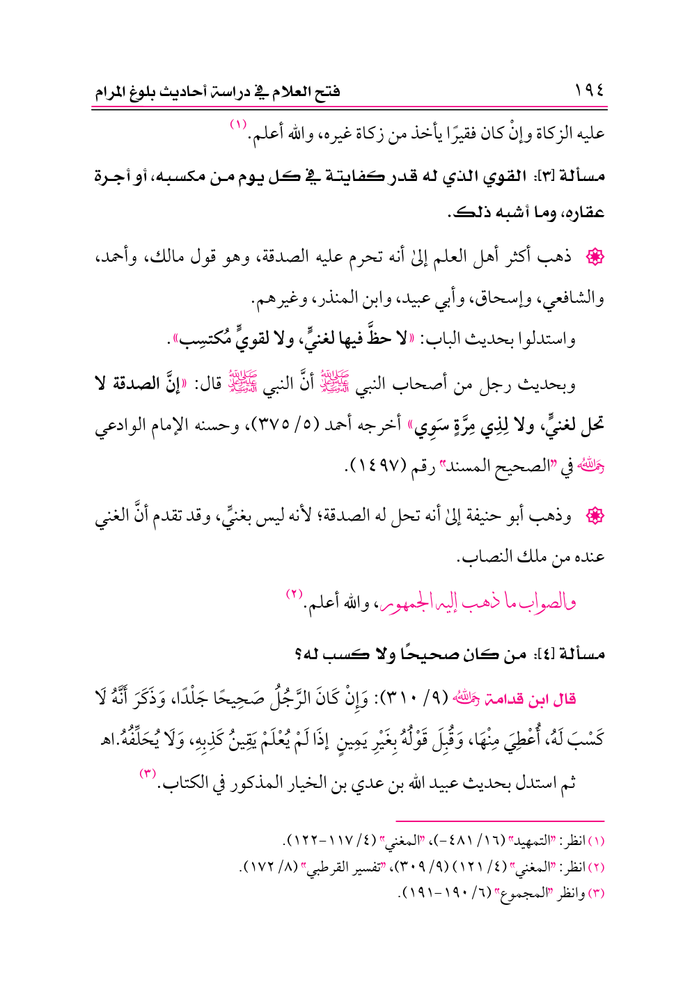 مسألة [٣]: القوي الذي له قدر كفايتة في كل يوم من مكسبه، أو أجرة عقاره، وما أشبه ذلك.
