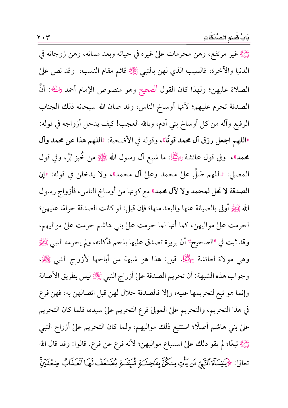 - صلى الله عليه وسلم - غير مرتفع، وهن محرمات على غيره في حياته وبعد مماته، وهن زوجاته في الدنيا والآخرة، فالسبب الذي لهن بالنبي - صلى الله عليه وسلم - قائم مقام النسب، وقد نص على الصلاة عليهن؛ ولهذا كان القول الصحيح وهو منصوص الإمام أحمد -رحمه الله-: أنَّ الصدقة تحرم عليهم؛ لأنها أوساخ الناس، وقد صان الله سبحانه ذلك الجناب الرفيع وآله من كل أوساخ بني آدم، ويالله العجب! كيف يدخل أزواجه في قوله: «اللهم اجعل رزق آل محمد قوتًا»، وقوله في الأضحية: «اللهم هذا عن محمد وآل محمد»، وفي قول عائشة -رضي الله عنها-: ما شبع آل رسول الله - صلى الله عليه وسلم - من خُبز بُرٍّ، وفي قول المصلي: «اللهم صَلِّ على محمد وعلى آل محمد»، ولا يدخلن في قوله: «إن الصدقة لا تحل لمحمد ولا لآل محمد» مع كونها من أوساخ الناس، فأزواج رسول الله - صلى الله عليه وسلم - أولى بالصيانة عنها والبعد منها؛ فإن قيل: لو كانت الصدقة حرامًا عليهن؛ لحرمت على مواليهن، كما أنها لما حرمت على بني هاشم حرمت على مواليهم، وقد ثبت في «الصحيح» أن بريرة تصدق عليها بلحم فأكلته، ولم يحرمه النبي - صلى الله عليه وسلم - وهي مولاة لعائشة -رضي الله عنها-.