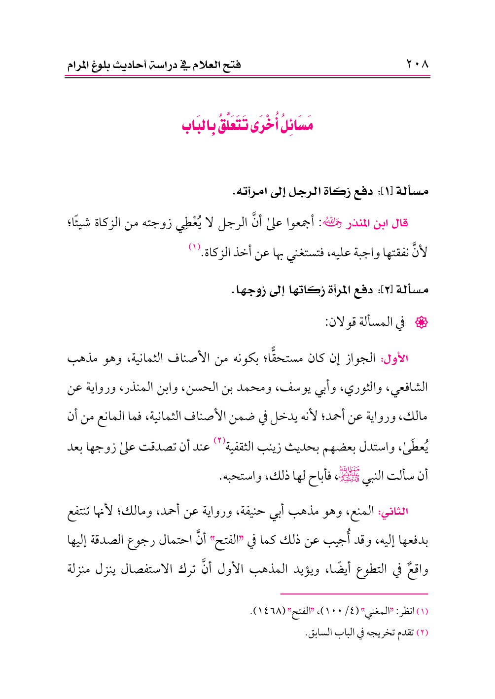 الثاني: المنع، وهو مذهب أبي حنيفة، ورواية عن أحمد، ومالك؛ لأنها تنتفع بدفعها إليه، وقد أُجيب عن ذلك كما في «الفتح» أنَّ احتمال رجوع الصدقة إليها واقعٌ في التطوع أيضًا، ويؤيد المذهب الأول أنَّ ترك الاستفصال ينزل منزلة