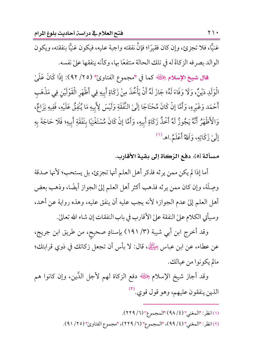 وقد أجاز شيخ الإسلام -رحمه الله- دفع الزكاة لهم لأجل الدَّين، وإن كانوا هم الذين ينفقون عليهم، وهو قول قوي. (¬٢)