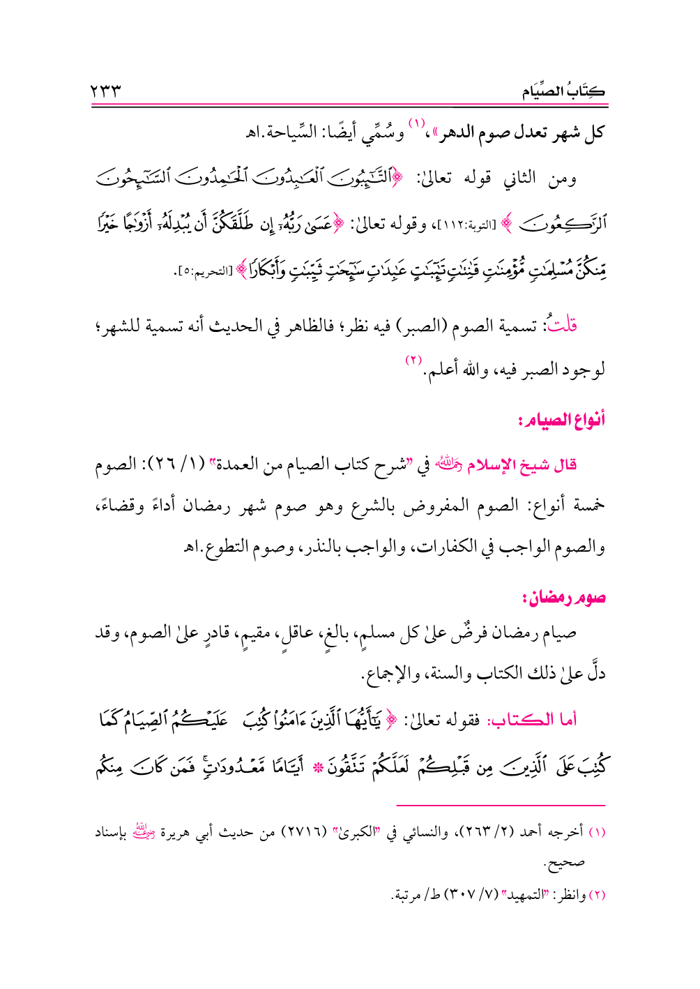 قال شيخ الإسلام -رحمه الله- في «شرح كتاب الصيام من العمدة» (١/ ٢٦): الصوم خمسة أنواع: الصوم المفروض بالشرع وهو صوم شهر رمضان أداءً وقضاءً، والصوم الواجب في الكفارات، والواجب بالنذر، وصوم التطوع. اهـ