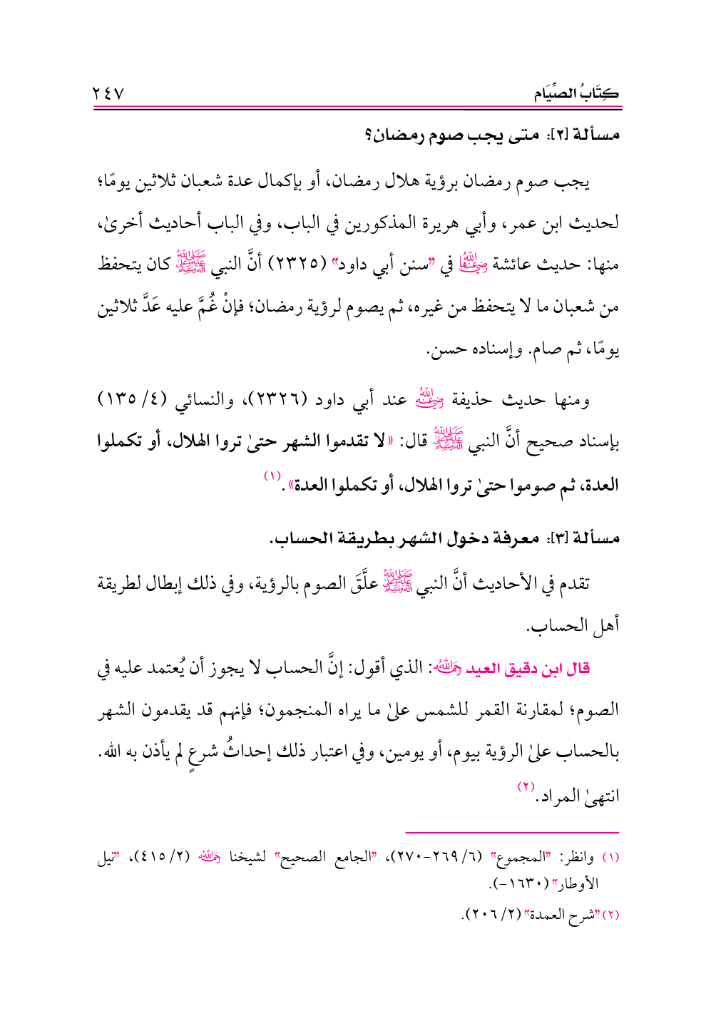 يجب صوم رمضان برؤية هلال رمضان، أو بإكمال عدة شعبان ثلاثين يومًا؛ لحديث ابن عمر، وأبي هريرة المذكورين في الباب، وفي الباب أحاديث أخرى، منها: حديث عائشة -رضي الله عنها- في «سنن أبي داود» (٢٣٢٥) أنَّ النبي -صلى الله عليه وعلى آله وسلم- كان يتحفظ من شعبان ما لا يتحفظ من غيره، ثم يصوم لرؤية رمضان؛ فإنْ غُمَّ عليه عَدَّ ثلاثين يومًا، ثم صام. وإسناده حسن.