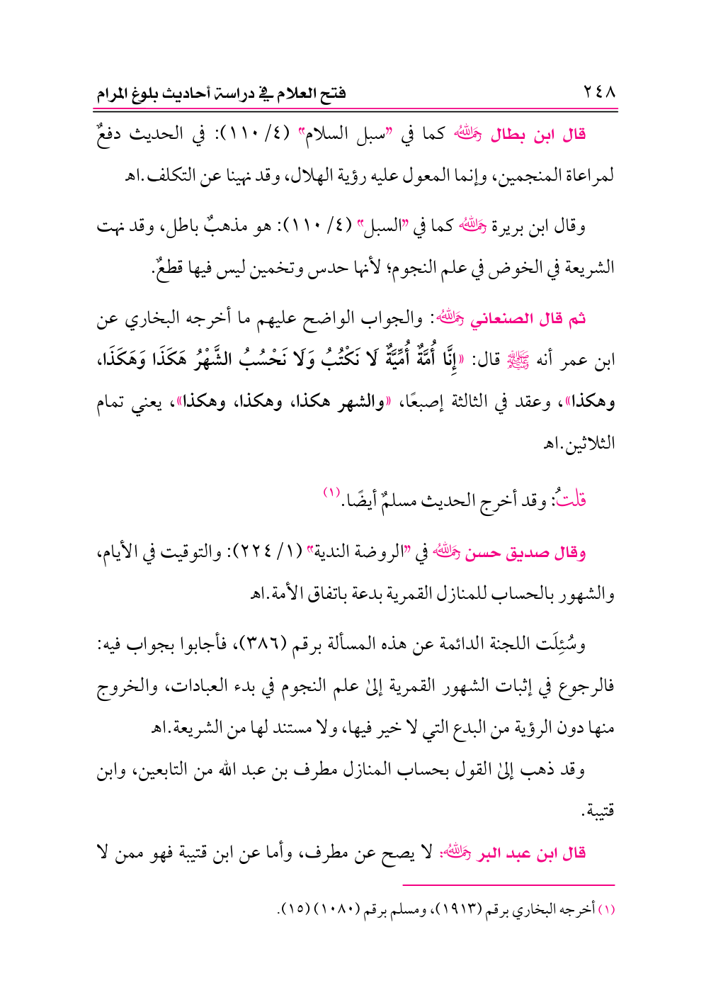 قال ابن بطال -رحمه الله- كما في «سبل السلام» (٤/ ١١٠): في الحديث دفعٌ لمراعاة المنجمين، وإنما المعول عليه رؤية الهلال، وقد نهينا عن التكلف. اهـ