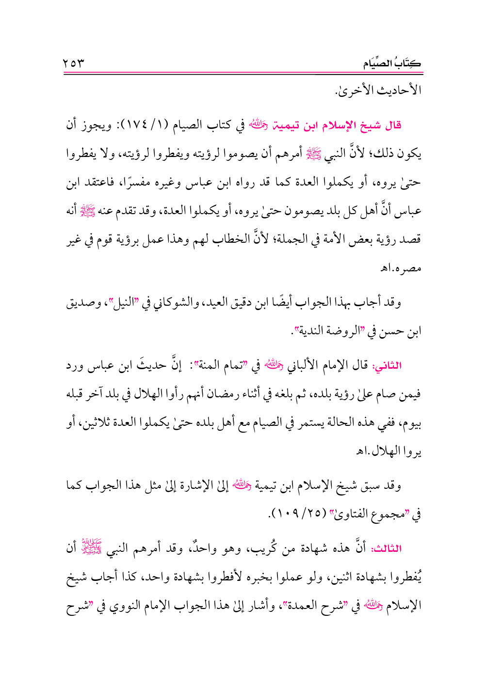 الثاني: قال الإمام الألباني -رحمه الله- في «تمام المنة»: إنَّ حديثَ ابن عباس ورد فيمن صام على رؤية بلده، ثم بلغه في أثناء رمضان أنهم رأوا الهلال في بلد آخر قبله بيوم، ففي هذه الحالة يستمر في الصيام مع أهل بلده حتى يكملوا العدة ثلاثين، أو يروا الهلال. اهـ