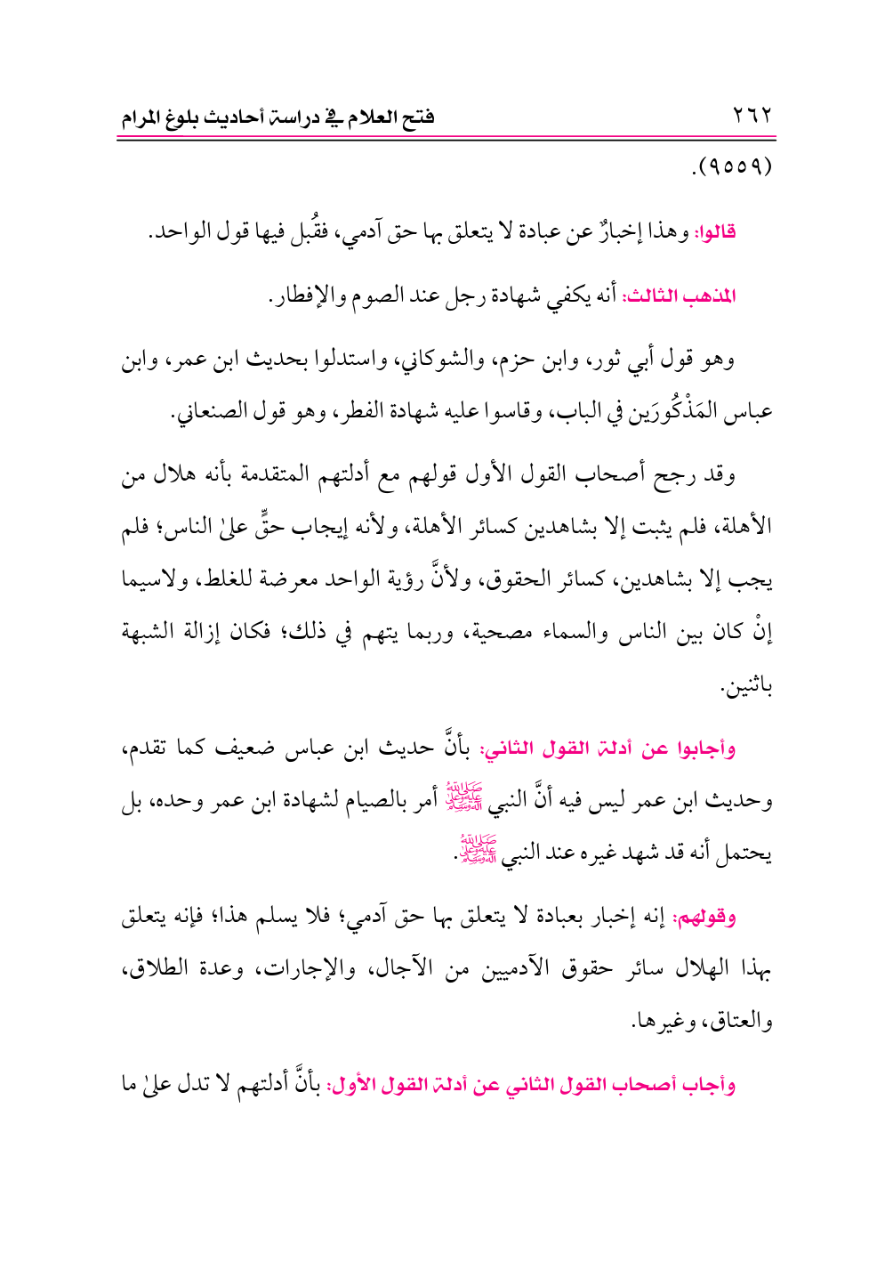 وأجابوا عن أدلة القول الثاني: بأنَّ حديث ابن عباس ضعيف كما تقدم، وحديث ابن عمر ليس فيه أنَّ النبي -صلى الله عليه وعلى آله وسلم- أمر بالصيام لشهادة ابن عمر وحده، بل يحتمل أنه قد شهد غيره عند النبي -صلى الله عليه وعلى آله وسلم-.