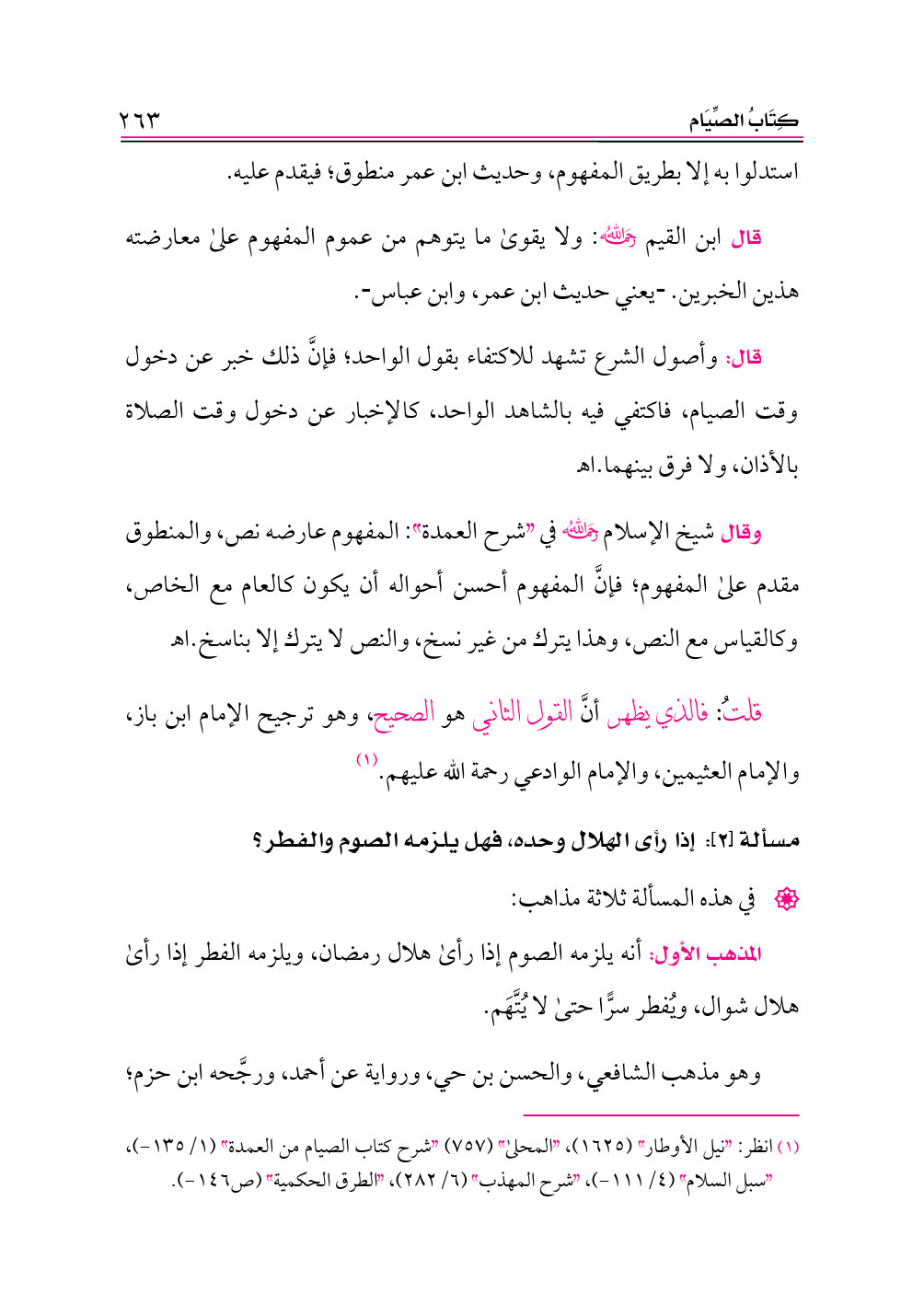 (¬١) انظر: «نيل الأوطار» (١٦٢٥)، «المحلى» (٧٥٧) «شرح كتاب الصيام من العمدة» (١/ ١٣٥ - )، «سبل السلام» (٤/ ١١١ - )، «شرح المهذب» (٦/ ٢٨٢)، «الطرق الحكمية» (ص ١٤٦ - ).