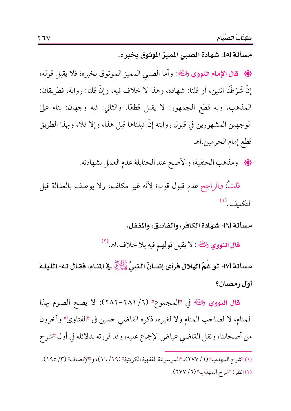 • قال الإمام النووي -رحمه الله-: وأما الصبي المميز الموثوق بخبره؛ فلا يقبل قوله، إنْ شَرَطْنَا اثنين، أو قلنا: شهادة، وهذا لا خلاف فيه، وإنْ قلنا: رواية، فطريقان: المذهب، وبه قطع الجمهور: لا يقبل قطعًا. والثاني: فيه وجهان: بناء على الوجهين المشهورين في قبول روايته إنْ قبلناها قبل هذا، وإلا فلا، وبهذا الطريق قطع إمام الحرمين. اهـ.