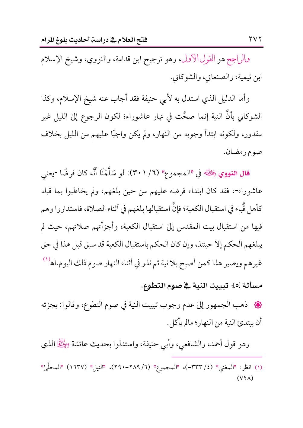 وأما الدليل الذي استدل به لأبي حنيفة فقد أجاب عنه شيخ الإسلام، وكذا الشوكاني بأنَّ النية إنما صحَّت في نهار عاشوراء؛ لكون الرجوع إلى الليل غير مقدور، ولكونه ابتدأ وجوبه من النهار، ولم يكن واجبًا عليهم من الليل بخلاف صوم رمضان.