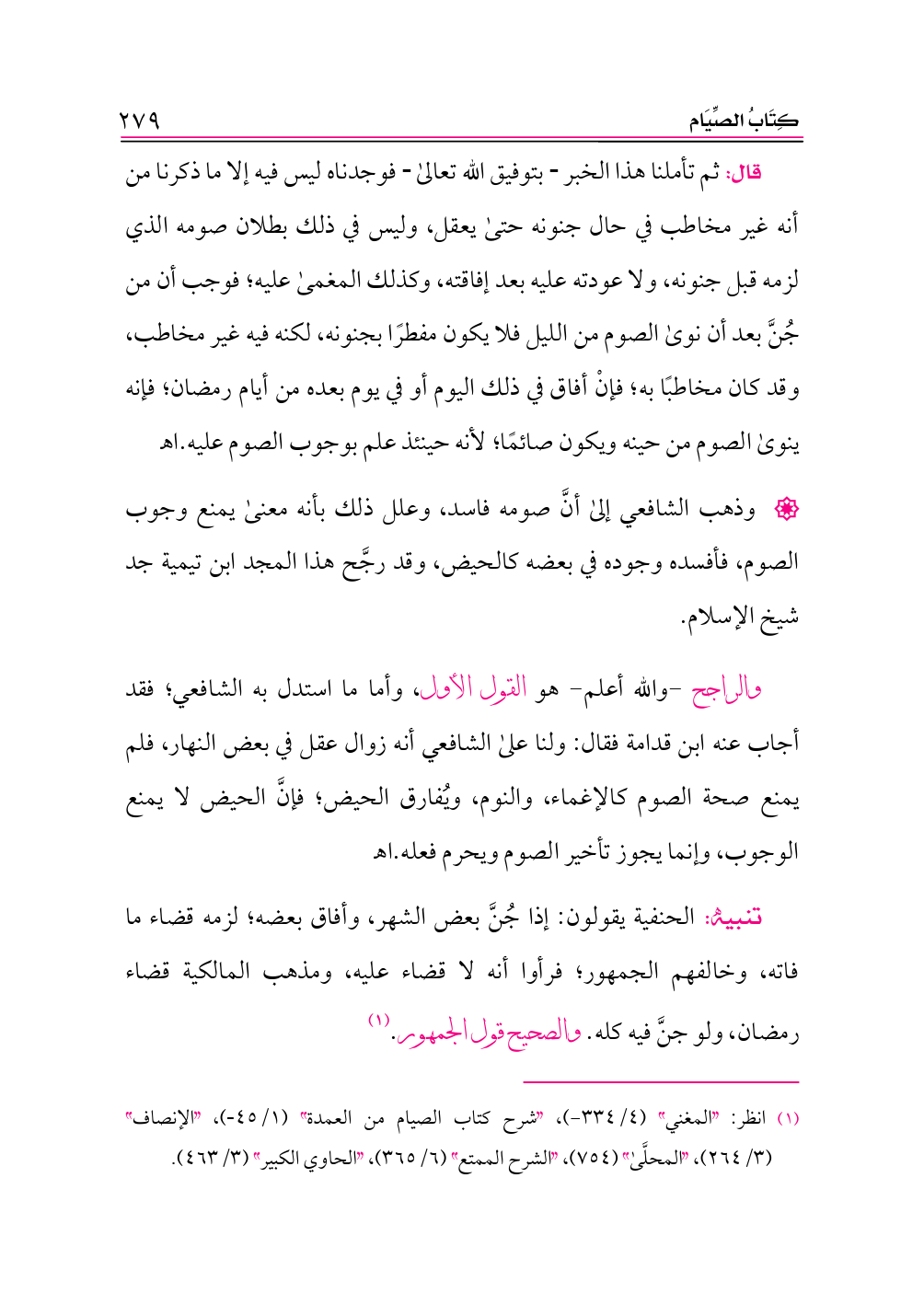 (¬١) انظر: «المغني» (٤/ ٣٣٤ - )، «شرح كتاب الصيام من العمدة» (١/ ٤٥)، «الإنصاف» (٣/ ٢٦٤)، «المحلَّى» (٧٥٤)، «الشرح الممتع» (٦/ ٣٦٥)، «الحاوي الكبير» (٣/ ٤٦٣).