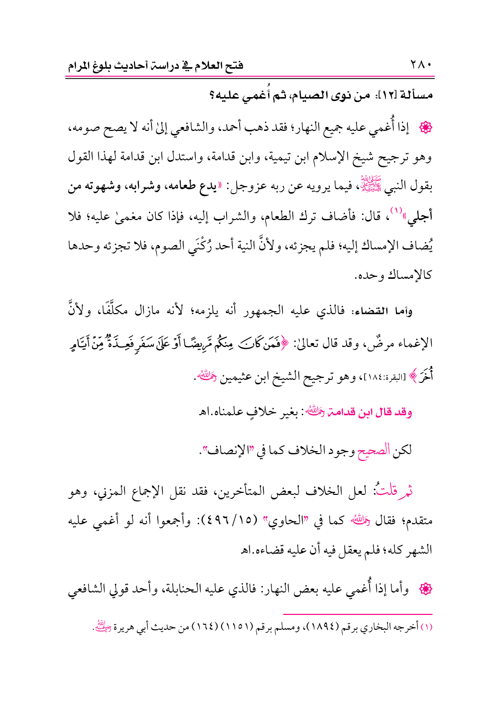 • إذا أُغمي عليه جميع النهار؛ فقد ذهب أحمد، والشافعي إلى أنه لا يصح صومه، وهو ترجيح شيخ الإسلام ابن تيمية، وابن قدامة، واستدل ابن قدامة لهذا القول بقول النبي -صلى الله عليه وعلى آله وسلم-، فيما يرويه عن ربه عزوجل: «يدع طعامه، وشرابه، وشهوته من أجلي» (¬١)، قال: فأضاف ترك الطعام، والشراب إليه، فإذا كان مغمى عليه؛ فلا يُضاف الإمساك إليه؛ فلم يجزئه، ولأنَّ النية أحد رُكْنَي الصوم، فلا تجزئه وحدها كالإمساك وحده.