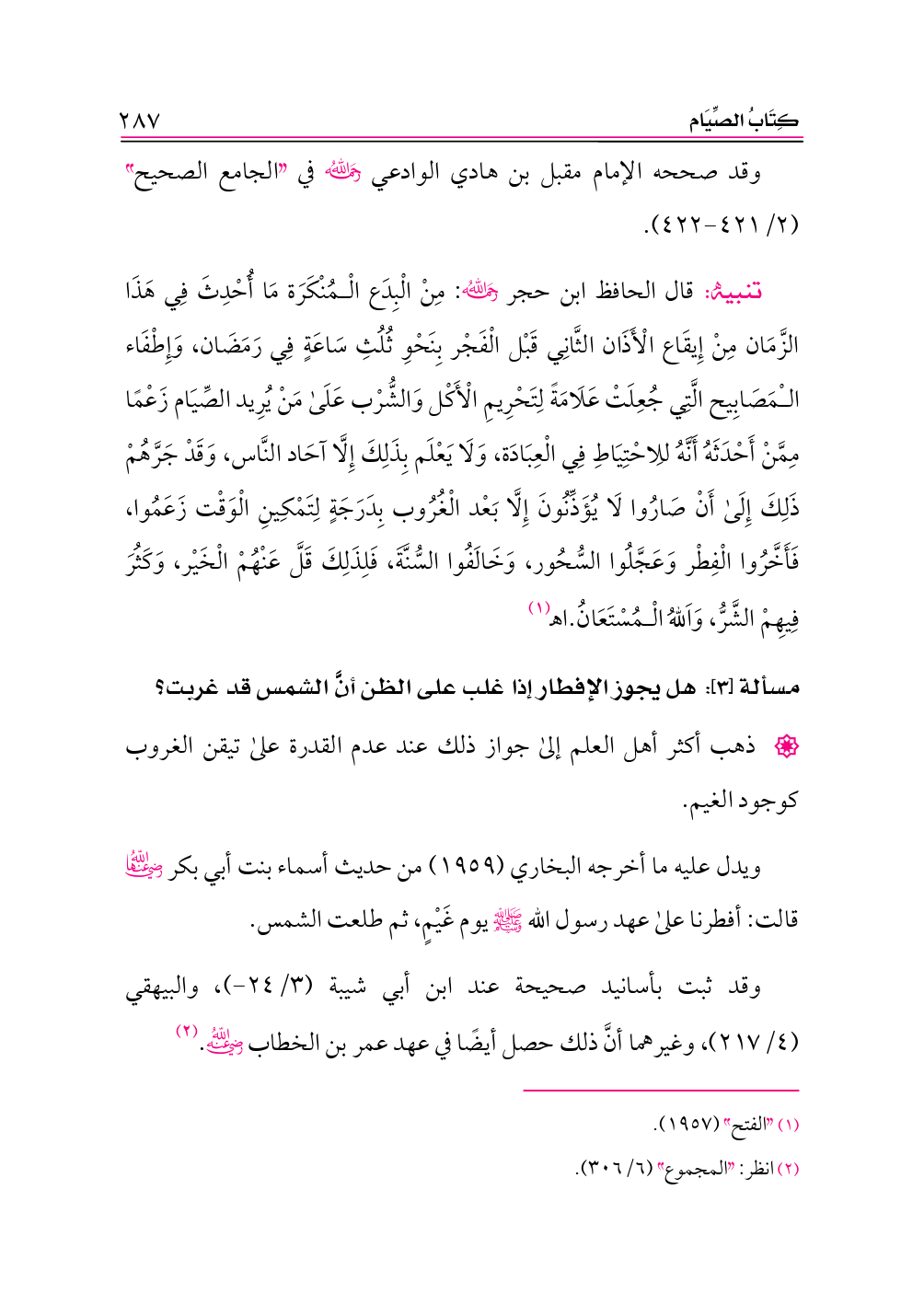 ويدل عليه ما أخرجه البخاري (١٩٥٩) من حديث أسماء بنت أبي بكر -رضي الله عنها- قالت: أفطرنا على عهد رسول الله - صلى الله عليه وسلم - يوم غَيْمٍ، ثم طلعت الشمس.