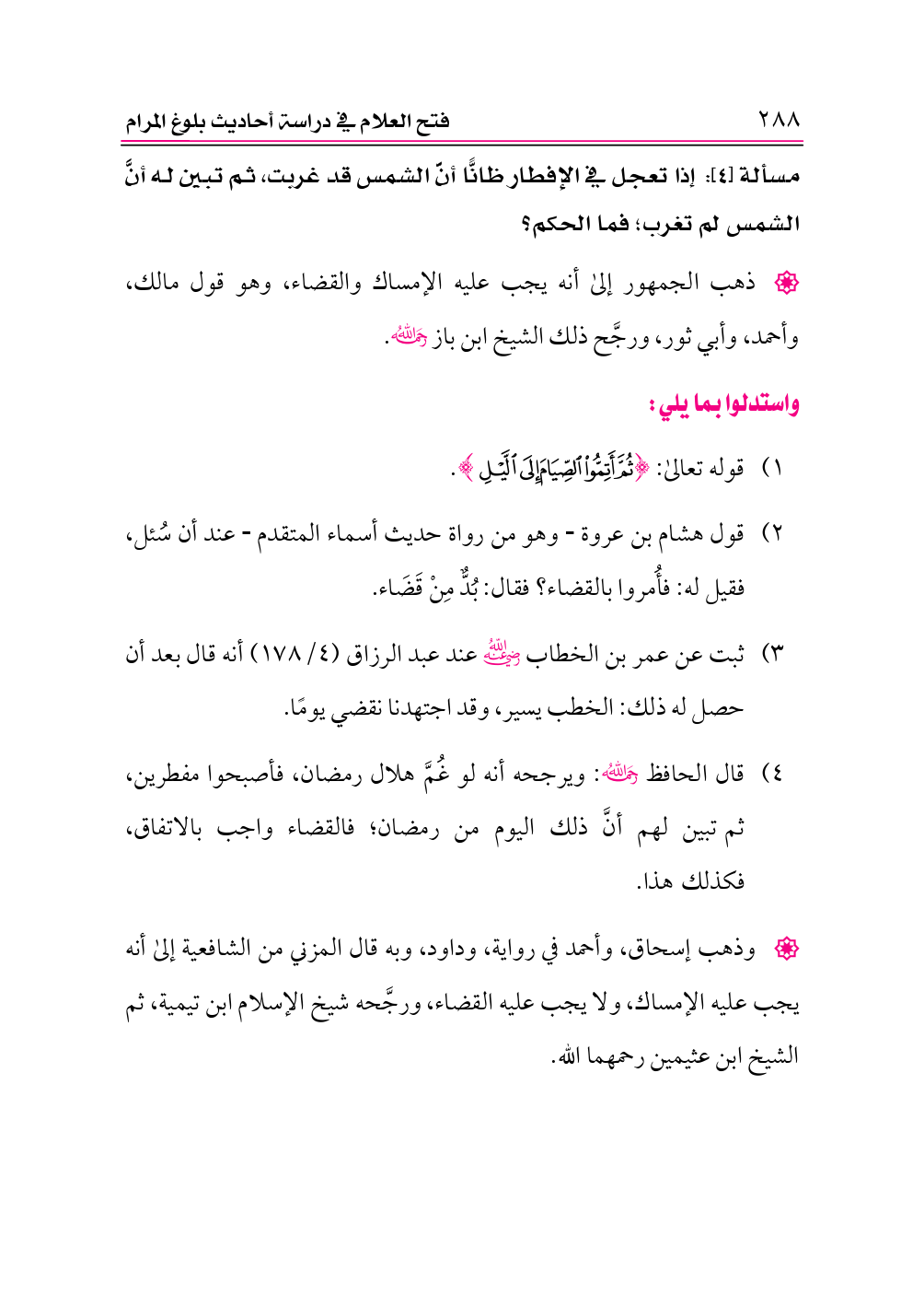 ٤) قال الحافظ -رحمه الله-: ويرجحه أنه لو غُمَّ هلال رمضان، فأصبحوا مفطرين، ثم تبين لهم أنَّ ذلك اليوم من رمضان؛ فالقضاء واجب بالاتفاق، فكذلك هذا.