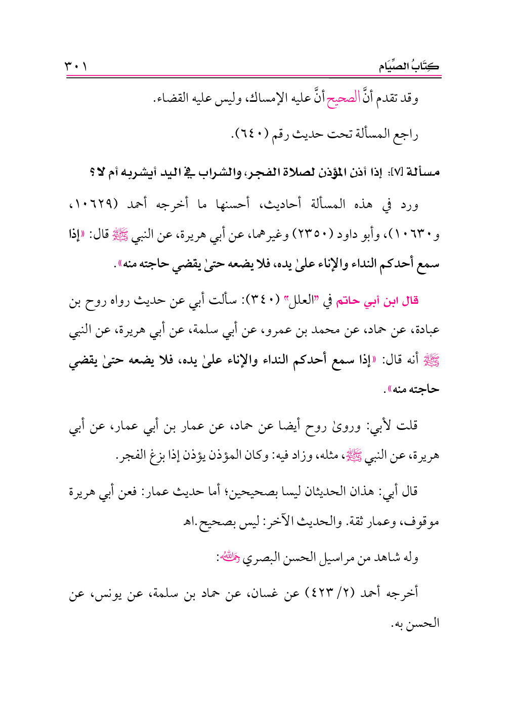 قلت لأبي: وروى روح أيضا عن حماد، عن عمار بن أبي عمار، عن أبي هريرة، عن النبي - صلى الله عليه وسلم -، مثله، وزاد فيه: وكان المؤذن يؤذن إذا بزغ الفجر.