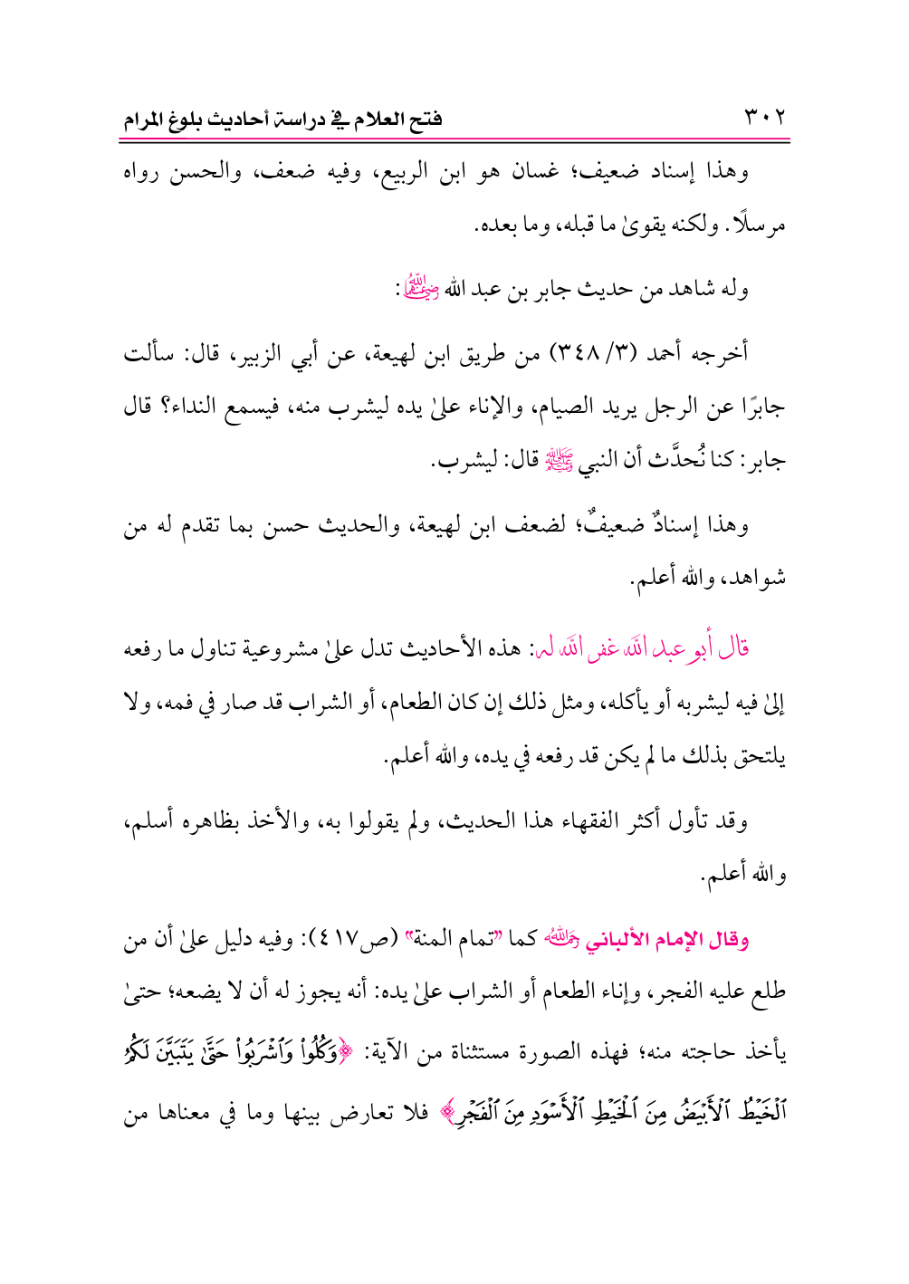 وقال الإمام الألباني -رحمه الله- كما «تمام المنة» (ص ٤١٧): وفيه دليل على أن من طلع عليه الفجر، وإناء الطعام أو الشراب على يده: أنه يجوز له أن لا يضعه؛ حتى يأخذ حاجته منه؛ فهذه الصورة مستثناة من الآية: {وَكُلُوا وَاشْرَبُوا حَتَّى يَتَبَيَّنَ لَكُمُ الْخَيْطُ الْأَبْيَضُ مِنَ الْخَيْطِ الْأَسْوَدِ مِنَ الْفَجْرِ} فلا تعارض بينها وما في معناها من