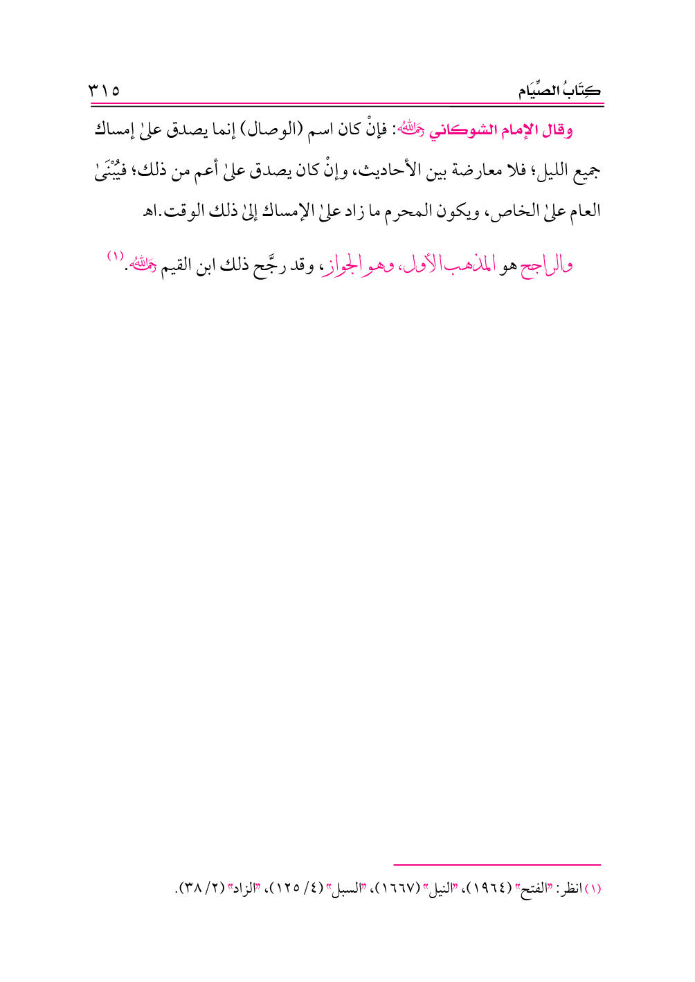وقال الإمام الشوكاني -رحمه الله-: فإنْ كان اسم (الوصال) إنما يصدق على إمساك جميع الليل؛ فلا معارضة بين الأحاديث، وإنْ كان يصدق على أعم من ذلك؛ فيُبْنَى العام على الخاص، ويكون المحرم ما زاد على الإمساك إلى ذلك الوقت. اهـ