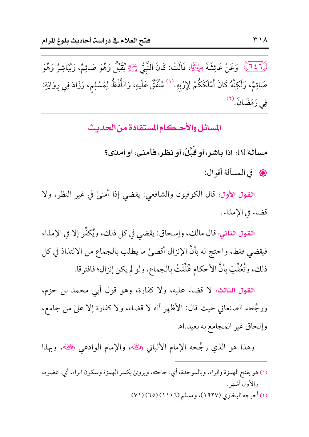 ٦٤٦ - وَعَنْ عَائِشَةَ -رضي الله عنها-، قَالَتْ: كَانَ النَّبِيُّ - صلى الله عليه وسلم - يُقَبِّلُ وَهُوَ صَائِمٌ، وَيُبَاشِرُ وَهُوَ صَائِمٌ، وَلَكِنَّهُ كَانَ أَمْلَكَكُمْ لِإِرْبِهِ. (¬١) مُتَّفَقٌ عَلَيْهِ، وَاللَّفْظُ لِمُسْلِمٍ، وَزَادَ فِي رِوَايَةٍ: فِي رَمَضَانَ. (¬٢)