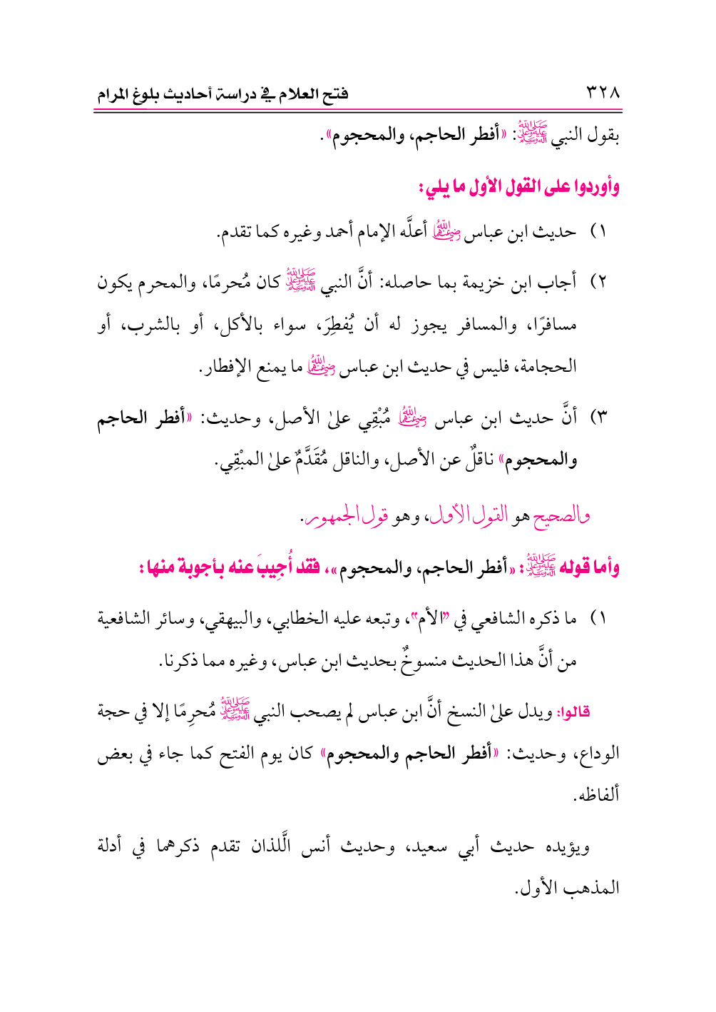 قالوا: ويدل على النسخ أنَّ ابن عباس لم يصحب النبي -صلى الله عليه وعلى آله وسلم- مُحرِمًا إلا في حجة الوداع، وحديث: «أفطر الحاجم والمحجوم» كان يوم الفتح كما جاء في بعض ألفاظه.