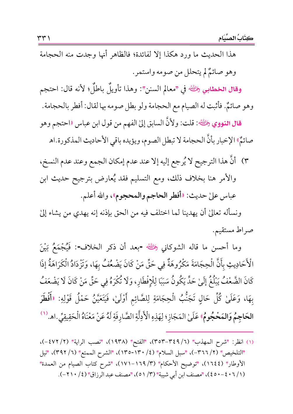 وما أحسن ما قاله الشوكاني -رحمه الله- بعد أن ذكر الخلاف: فَيُجْمَعُ بَيْنَ الْأَحَادِيثِ بِأَنَّ الْحِجَامَةَ مَكْرُوهَةٌ فِي حَقِّ مَنْ كَانَ يَضْعُفُ بِهَا، وَتَزْدَادُ الْكَرَاهَةُ إذَا كَانَ الضَّعْفُ يَبْلُغُ إلَى حَدٍّ يَكُونُ سَبَبًا لِلْإِفْطَارِ، وَلَا تُكْرَهُ فِي حَقِّ مَنْ كَانَ لَا يَضْعَفُ بِهَا، وَعَلَى كُلِّ حَالٍ تَجَنُّبُ الْحِجَامَةِ لِلصَّائِمِ أَوْلَى، فَيَتَعَيَّنُ حَمْلُ قَوْلِهِ: «أَفْطَرَ الحَاجِمُ وَالمَحْجُومُ» عَلَى المَجَازِ؛ لِهَذِهِ الْأَدِلَّةِ الصَّارِفَةِ لَهُ عَنْ مَعْنَاهُ الْحَقِيقِيِّ. اهـ. (¬١)