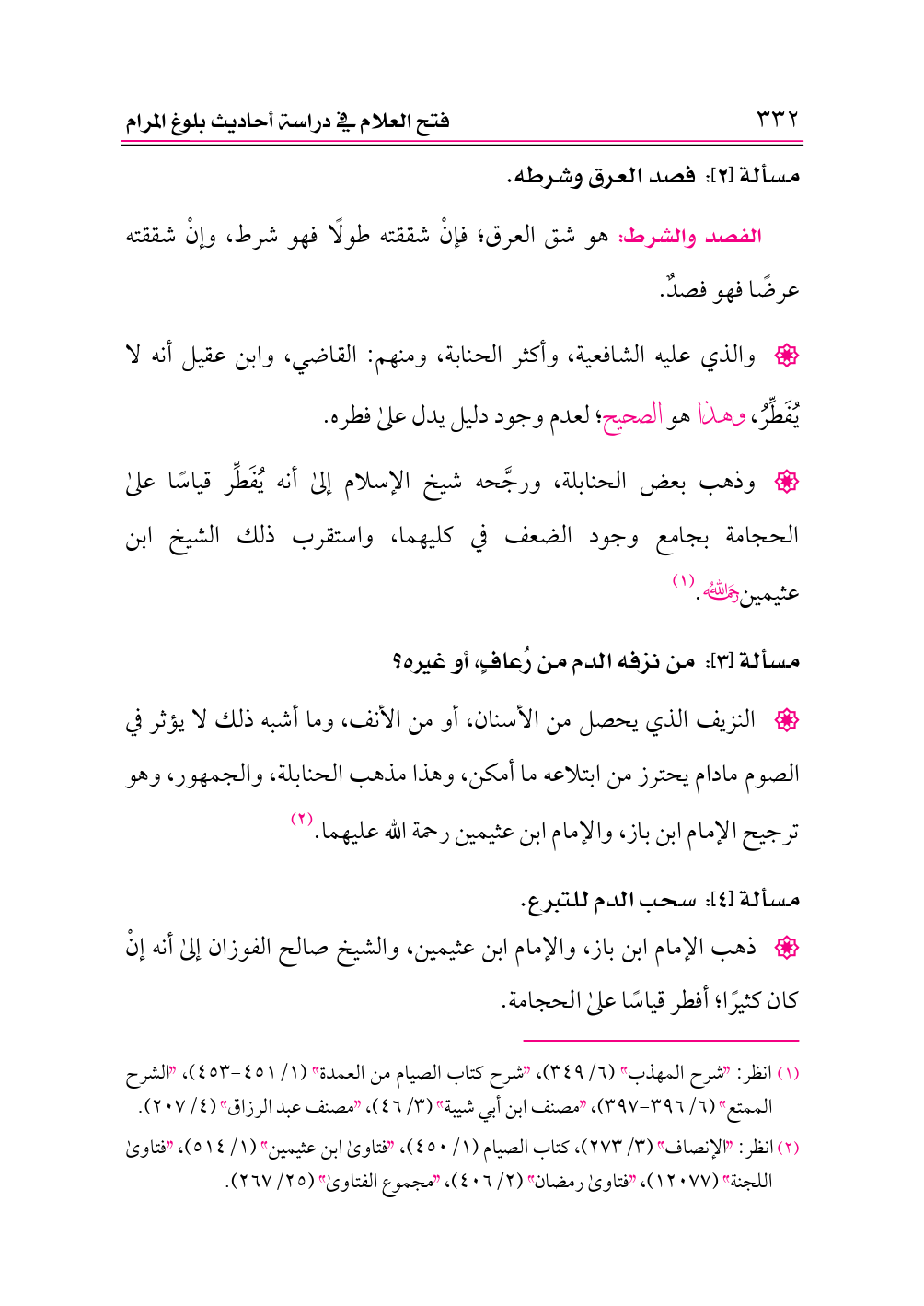 • النزيف الذي يحصل من الأسنان، أو من الأنف، وما أشبه ذلك لا يؤثر في الصوم مادام يحترز من ابتلاعه ما أمكن، وهذا مذهب الحنابلة، والجمهور، وهو ترجيح الإمام ابن باز، والإمام ابن عثيمين رحمة الله عليهما. (¬٢)