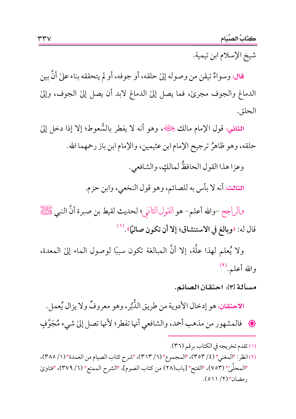 (¬٢) انظر: «المغني» (٤/ ٣٥٣)، «المجموع» (٦/ ٣١٣)، «شرح كتاب الصيام من العمدة» (١/ ٣٨٥)، «المحلَّى» (٧٥٣)، «الفتح» [باب (٢٨) من كتاب الصوم]، «الشرح الممتع» (٦/ ٣٧٩)، «فتاوى رمضان» (٢/ ٥١١).