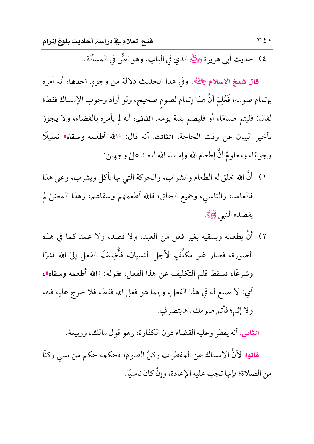 قال شيخ الإسلام -رحمه الله-: وفي هذا الحديث دلالة من وجوهٍ: أحدها: أنه أمره بإتمام صومه؛ فَعُلِمَ أنَّ هذا إتمام لصومٍ صحيح، ولو أراد وجوب الإمساك فقط؛ لقال: فليتم صيامًا، أو فليصم بقية يومه. الثاني: أنه لم يأمره بالقضاء، ولا يجوز تأخير البيان عن وقت الحاجة. الثالث: أنه قال: «الله أطعمه وسقاه» تعليلًا وجوابًا، ومعلومٌ أنَّ إطعام الله وإسقاء الله للعبد على وجهين: