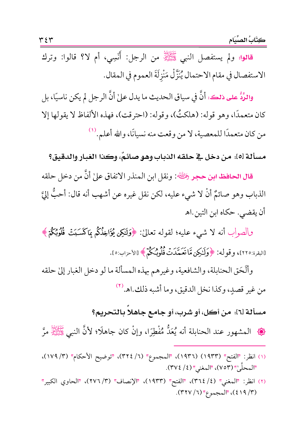 وألَحَق الحنابلة، والشافعية، وغيرهم بهذه المسألة ما لو دخل الغبار إلى حلقه من غير قصدٍ، وكذا نخل الدقيق، وما أشبه ذلك. اهـ. (¬٢)