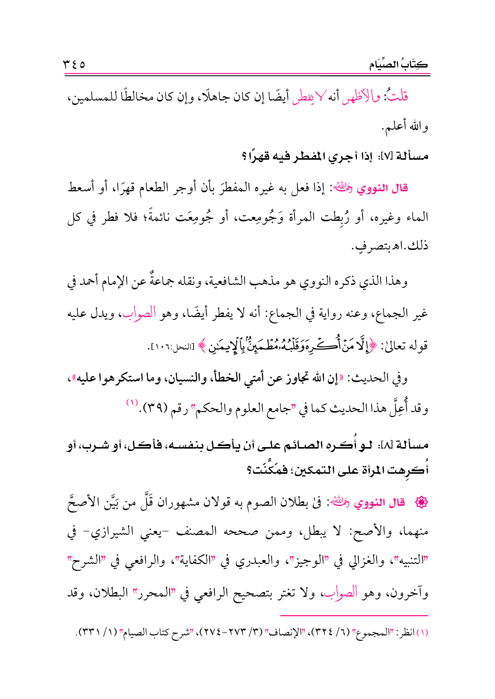 وهذا الذي ذكره النووي هو مذهب الشافعية، ونقله جماعةٌ عن الإمام أحمد في غير الجماع، وعنه رواية في الجماع: أنه لا يفطر أيضًا، وهو الصواب، ويدل عليه قوله تعالى: {إِلَّا مَنْ أُكْرِهَ وَقَلْبُهُ مُطْمَئِنٌّ بِالْإِيمَانِ} [النحل:١٠٦].