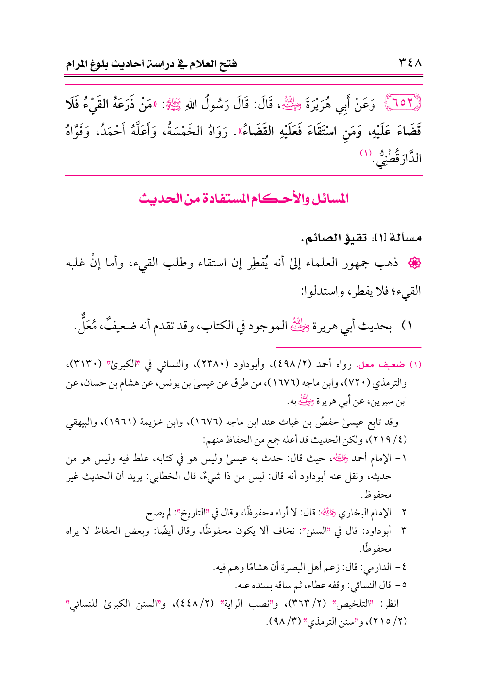 ٦٥٢ - وَعَنْ أَبِي هُرَيْرَةَ -رضي الله عنه-، قَالَ: قَالَ رَسُولُ اللهِ - صلى الله عليه وسلم -: «مَنْ ذَرَعَهُ القَيْءُ فَلَا قَضَاءَ عَلَيْهِ، وَمَنِ اسْتَقَاءَ فَعَلَيْهِ القَضَاءُ». رَوَاهُ الخَمْسَةُ، وَأَعَلَّهُ أَحْمَدُ، وَقَوَّاهُ الدَّارَقُطْنِيُّ. (¬١)