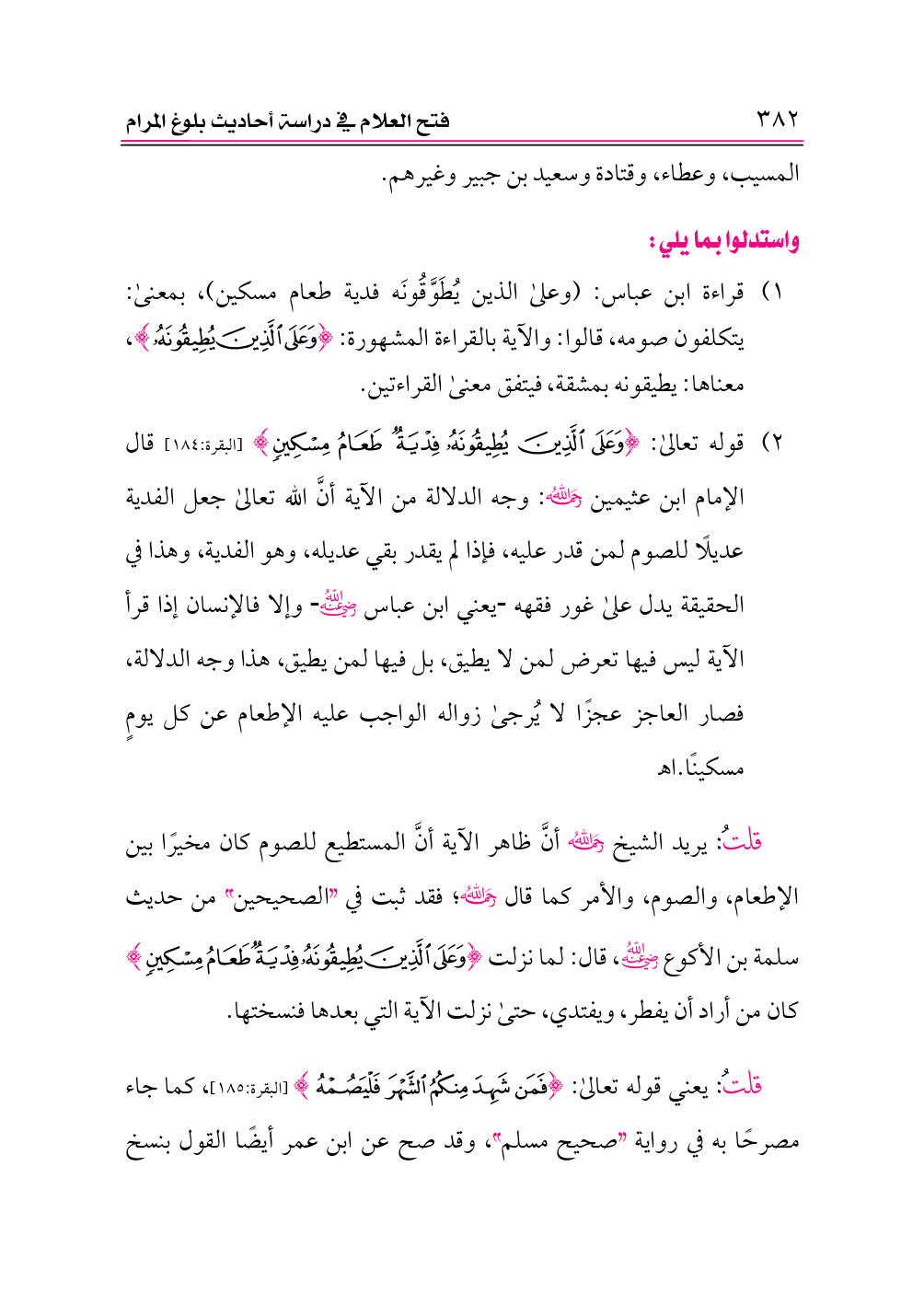 ١) قوله تعالى: {وَعَلَى الَّذِينَ يُطِيقُونَهُ فِدْيَةٌ طَعَامُ مِسْكِينٍ} [البقرة:١٨٤] قال الإمام ابن عثيمين -رحمه الله-: وجه الدلالة من الآية أنَّ الله تعالى جعل الفدية عديلًا للصوم لمن قدر عليه، فإذا لم يقدر بقي عديله، وهو الفدية، وهذا في الحقيقة يدل على غور فقهه يعني ابن عباس -رضي الله عنه- وإلا فالإنسان إذا قرأ الآية ليس فيها تعرض لمن لا يطيق، بل فيها لمن يطيق، هذا وجه الدلالة، فصار العاجز عجزًا لا يُرجى زواله الواجب عليه الإطعام عن كل يومٍ مسكينًا. اهـ