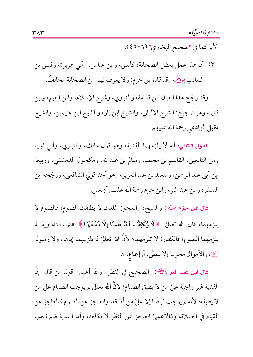 قال ابن عبد البر -رحمه الله-: والصحيح في النظر -والله أعلم- قول من قال: إنَّ الفدية غير واجبة على من لا يطيق الصيام؛ لأنَّ الله تعالى لم يوجب الصيام على من لا يطيقه؛ لأنه لم يوجب فرضًا إلا على من أطاقه، والعاجز عن الصوم كالعاجز عن القيام في الصلاة، وكالأعمى العاجز عن النظر لا يكلفه، وأما الفدية فلم تجب