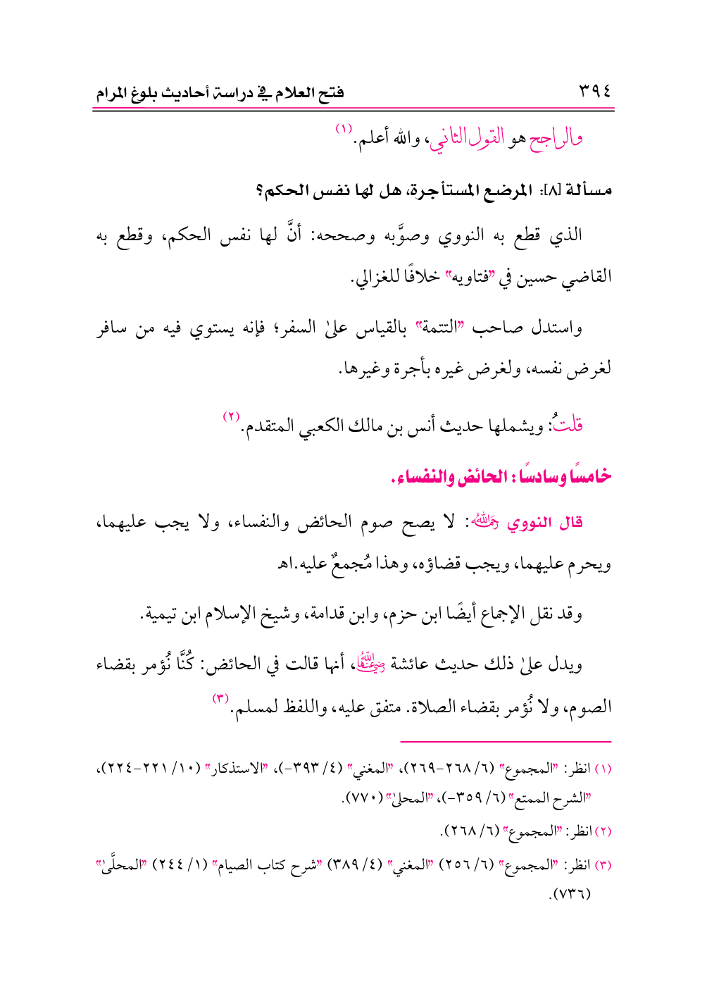 (¬١) انظر: «المجموع» (٦/ ٢٦٨ - ٢٦٩)، «المغني» (٤/ ٣٩٣ - )، «الاستذكار» (١٠/ ٢٢١ - ٢٢٤)، «الشرح الممتع» (٦/ ٣٥٩ - )، «المحلى» (٧٧٠).