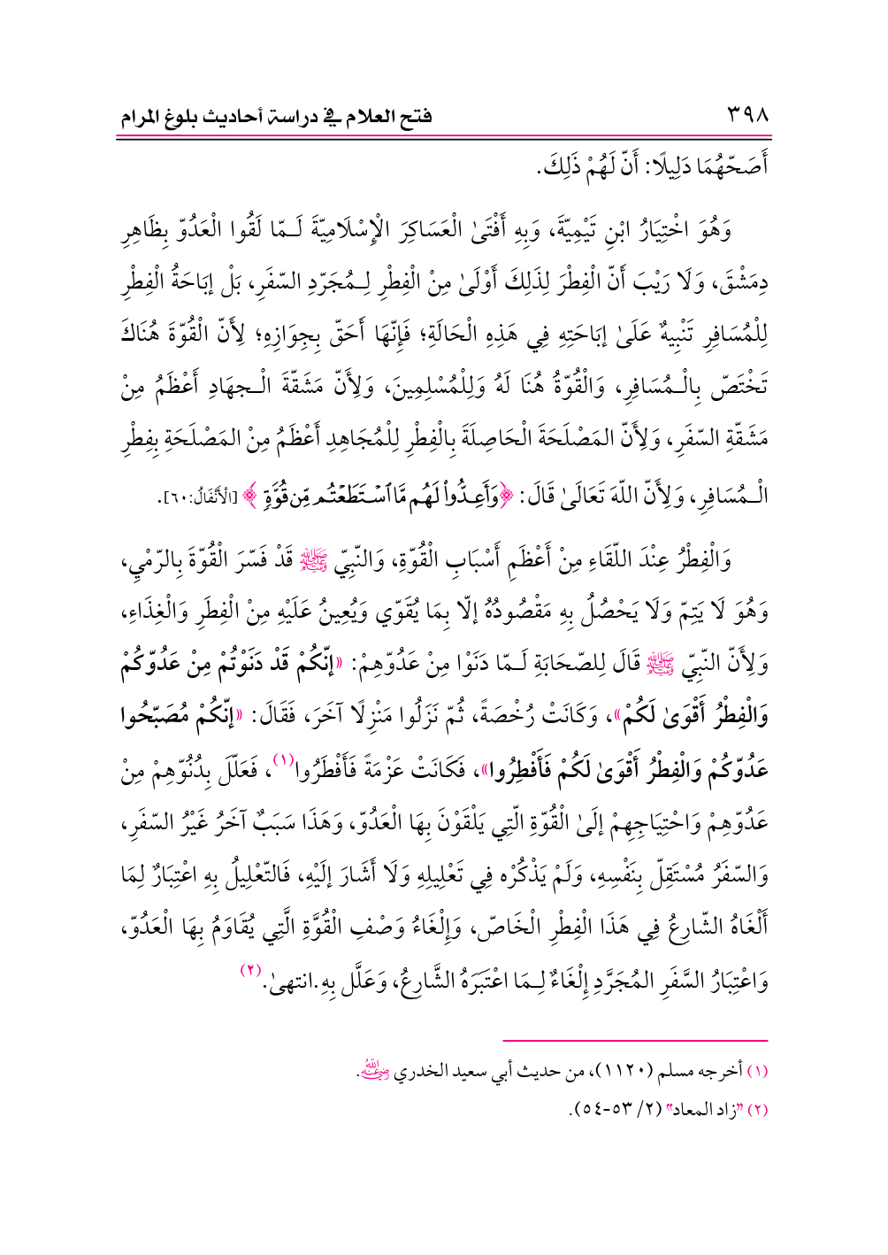 وَهُوَ اخْتِيَارُ ابْنِ تَيْمِيّةَ، وَبِهِ أَفْتَى الْعَسَاكِرَ الْإِسْلَامِيّةَ لَمّا لَقُوا الْعَدُوّ بِظَاهِرِ دِمَشْقَ، وَلَا رَيْبَ أَنّ الْفِطْرَ لِذَلِكَ أَوْلَى مِنْ الْفِطْرِ لِمُجَرّدِ السّفَرِ، بَلْ إبَاحَةُ الْفِطْرِ لِلْمُسَافِرِ تَنْبِيهٌ عَلَى إبَاحَتِهِ فِي هَذِهِ الْحَالَةِ؛ فَإِنّهَا أَحَقّ بِجِوَازِهِ؛ لِأَنّ الْقُوّةَ هُنَاكَ تَخْتَصّ بِالْمُسَافِرِ، وَالْقُوّةُ هُنَا لَهُ وَلِلْمُسْلِمِينَ، وَلِأَنّ مَشَقّةَ الْجهَادِ أَعْظَمُ مِنْ مَشَقّةِ السّفَرِ، وَلِأَنّ المَصْلَحَةَ الْحَاصِلَةَ بِالْفِطْرِ لِلْمُجَاهِدِ أَعْظَمُ مِنْ المَصْلَحَةِ بِفِطْرِ الْمُسَافِرِ، وَلِأَنّ اللّهَ تَعَالَى قَالَ: {وَأَعِدُّوا لَهُمْ مَا اسْتَطَعْتُمْ مِنْ قُوَّةٍ} [الْأَنْفَالُ:٦٠].