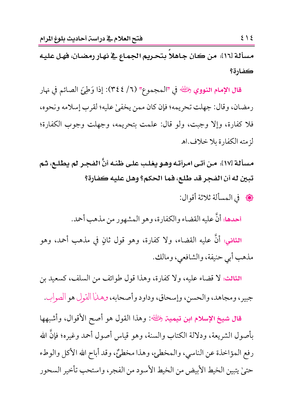 مسألة [١٧]: من أتى امرأته وهو يغلب على ظنه أنَّ الفجر لم يطلع، ثم تبين له أن الفجر قد طلع، فما الحكم؟ وهل عليه كفارة؟