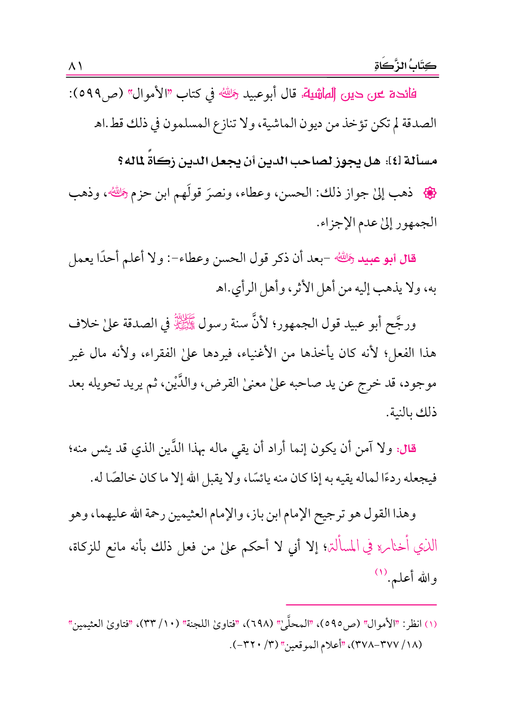 فائدة عن دين الماشية: قال أبوعبيد -رحمه الله- في كتاب «الأموال» (ص ٥٩٩): الصدقة لم تكن تؤخذ من ديون الماشية، ولا تنازع المسلمون في ذلك قط. اهـ