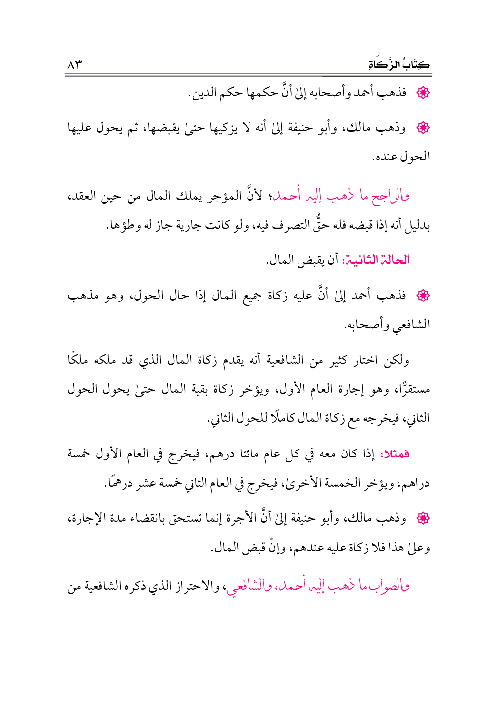 • وذهب مالك، وأبو حنيفة إلى أنَّ الأجرة إنما تستحق بانقضاء مدة الإجارة، وعلى هذا فلا زكاة عليه عندهم، وإنْ قبض المال.