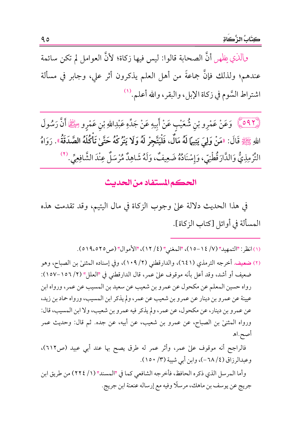 ٥٩٢ - وَعَنْ عَمْرِو بْنِ شُعَيْبٍ عَنْ أَبِيهِ عَنْ جَدِّهِ عَبْدِاللهِ بْنِ عَمْرٍو -رضي الله عنهما- أَنَّ رَسُولَ اللهِ - صلى الله عليه وسلم - قَالَ: «مَنْ وَلِيَ يَتِيمًا لَهُ مَالٌ، فَلْيَتَّجِرْ لَهُ وَلَا يَتْرُكْهُ حَتَّى تَأْكُلَهُ الصَّدَقَةُ». رَوَاهُ التِّرْمِذِيُّ وَالدَّارَقُطْنِيّ، وَإِسْنَادُهُ ضَعِيفٌ، وَلَهُ شَاهِدٌ مُرْسَلٌ عِنْدَ الشَّافِعِيِّ. (¬٢)