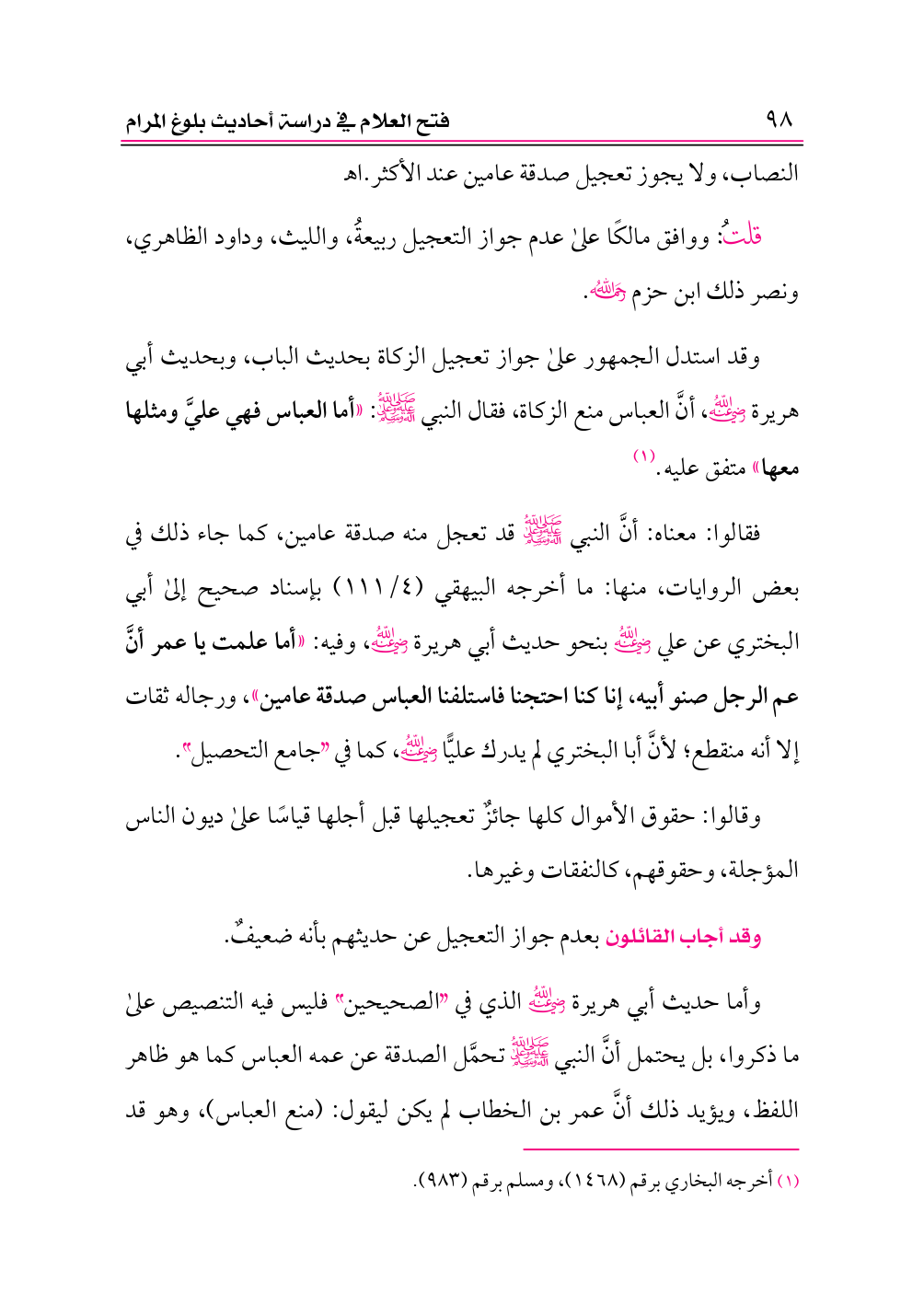 فقالوا: معناه: أنَّ النبي -صلى الله عليه وعلى آله وسلم- قد تعجل منه صدقة عامين، كما جاء ذلك في بعض الروايات، منها: ما أخرجه البيهقي (٤/ ١١١) بإسناد صحيح إلى أبي البختري عن علي -رضي الله عنه- بنحو حديث أبي هريرة -رضي الله عنه-، وفيه: «أما علمت يا عمر أنَّ عم الرجل صنو أبيه، إنا كنا احتجنا فاستلفنا العباس صدقة عامين»، ورجاله ثقات إلا أنه منقطع؛ لأنَّ أبا البختري لم يدرك عليًّا -رضي الله عنه-، كما في «جامع التحصيل».