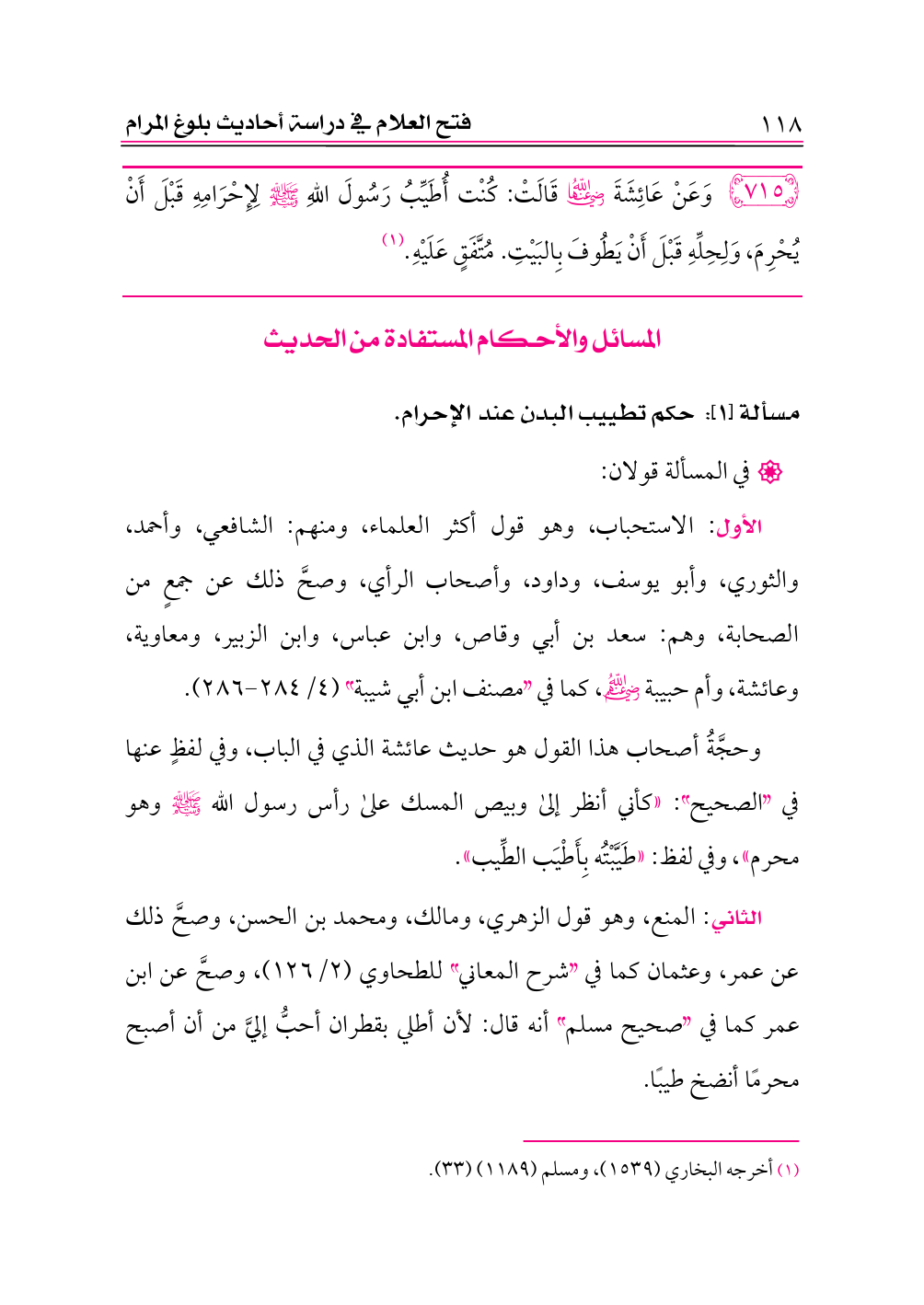 وحجَّةُ أصحاب هذا القول هو حديث عائشة الذي في الباب، وفي لفظٍ عنها في «الصحيح»: «كأني أنظر إلى وبيص المسك على رأس رسول الله - صلى الله عليه وسلم - وهو محرم»، وفي لفظ: «طَيَّبْتُه بِأَطْيَب الطِّيب».