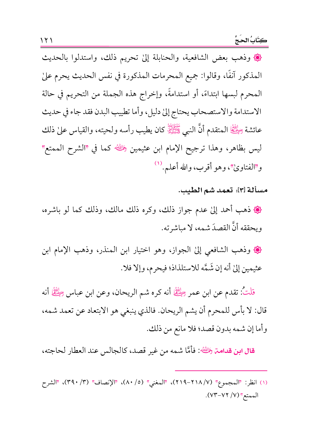 قلتُ: تقدم عن ابن عمر -رضي الله عنهما- أنه كره شم الريحان، وعن ابن عباس -رضي الله عنهما- أنه قال: لا بأس للمحرم أن يشم الريحان. فالذي ينبغي هو الابتعاد عن تعمد شمه، وأما إن شمه بدون قصد؛ فلا مانع من ذلك.