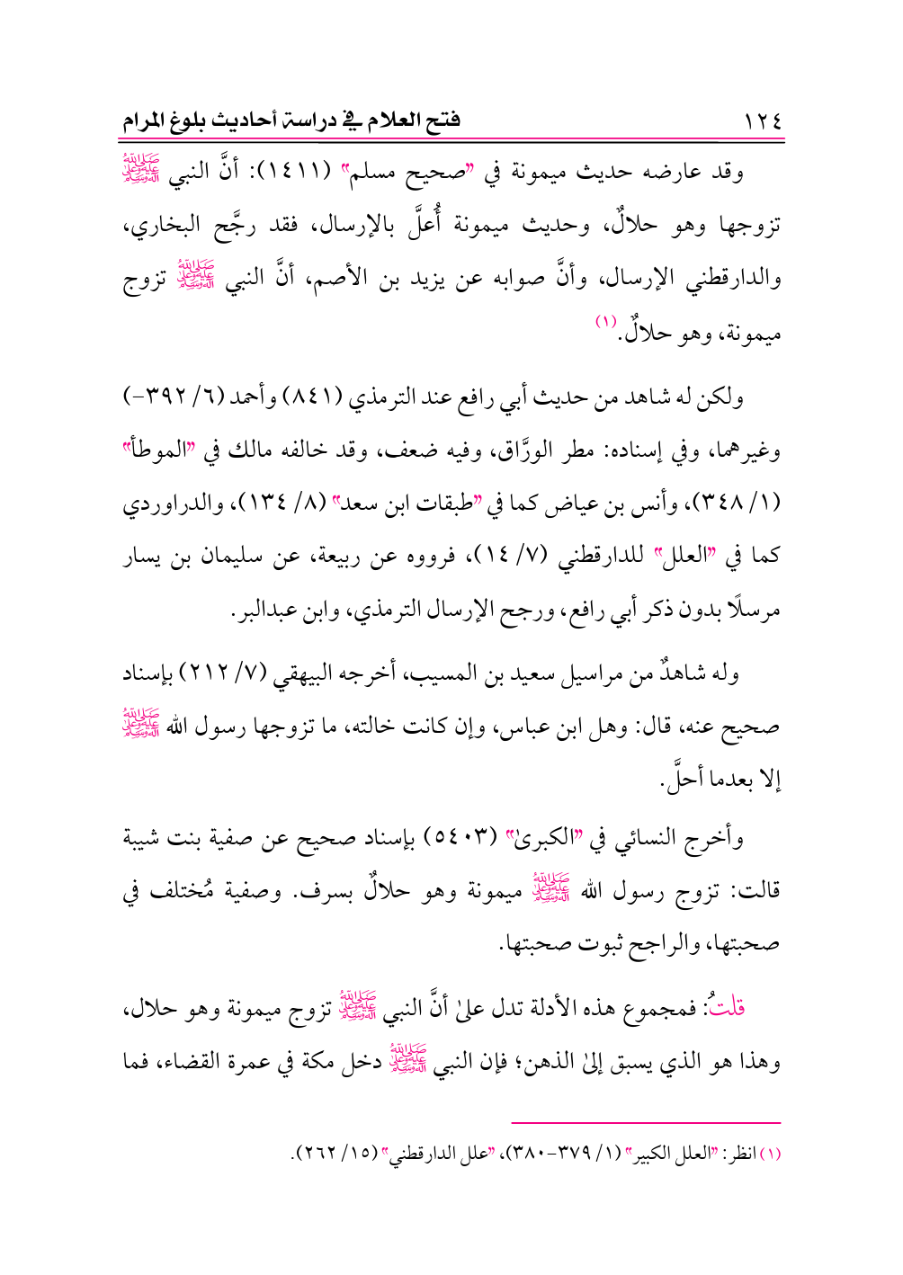 وقد عارضه حديث ميمونة في «صحيح مسلم» (١٤١١): أنَّ النبي -صلى الله عليه وعلى آله وسلم- تزوجها وهو حلالٌ، وحديث ميمونة أُعلَّ بالإرسال، فقد رجَّح البخاري، والدارقطني الإرسال، وأنَّ صوابه عن يزيد بن الأصم، أنَّ النبي -صلى الله عليه وعلى آله وسلم- تزوج ميمونة، وهو حلالٌ. (¬١)