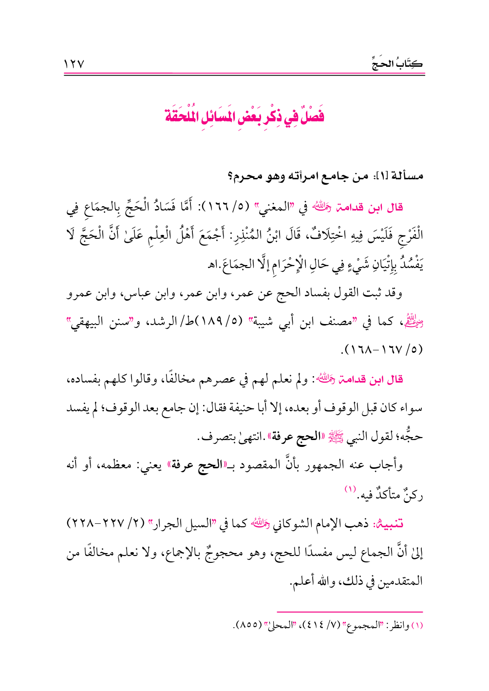 وقد ثبت القول بفساد الحج عن عمر، وابن عمر، وابن عباس، وابن عمرو -رضي الله عنهم-، كما في «مصنف ابن أبي شيبة» (٥/ ١٨٩) ط/الرشد، و «سنن البيهقي» (٥/ ١٦٧ - ١٦٨).