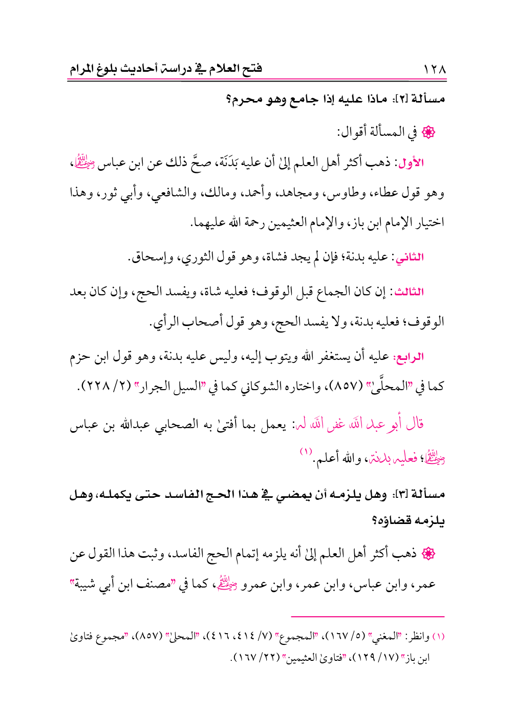 قال أبو عبد الله غفر الله له: يعمل بما أفتى به الصحابي عبدالله بن عباس -رضي الله عنهما-؛ فعليه بدنة، والله أعلم. (¬١)