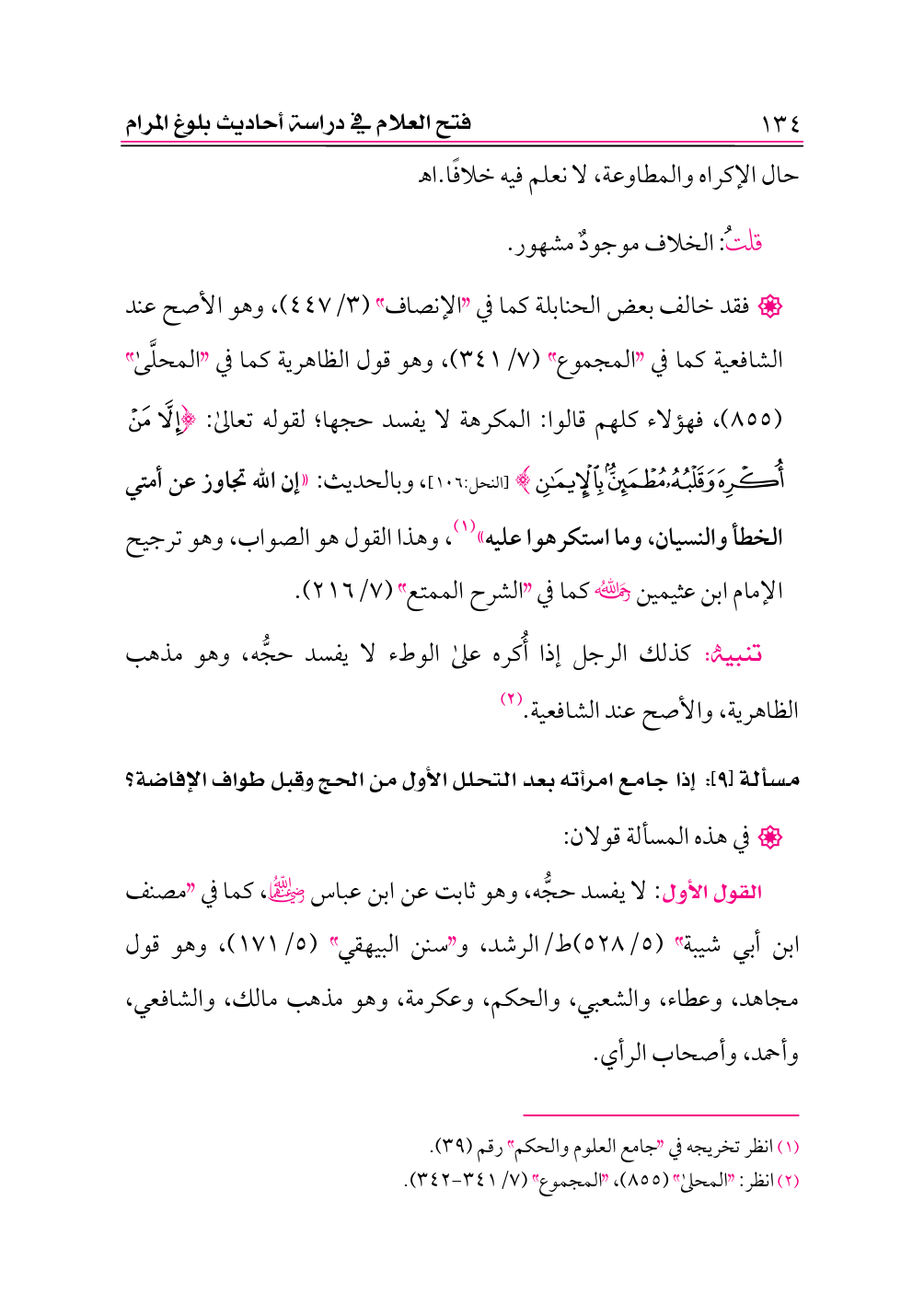 • فقد خالف بعض الحنابلة كما في «الإنصاف» (٣/ ٤٤٧)، وهو الأصح عند الشافعية كما في «المجموع» (٧/ ٣٤١)، وهو قول الظاهرية كما في «المحلَّى» (٨٥٥)، فهؤلاء كلهم قالوا: المكرهة لا يفسد حجها؛ لقوله تعالى: {إِلَّا مَنْ أُكْرِهَ وَقَلْبُهُ مُطْمَئِنٌّ بِالْإِيمَانِ} [النحل:١٠٦]، وبالحديث: «إن الله تجاوز عن أمتي الخطأ والنسيان، وما استكرهوا عليه» (¬١)، وهذا القول هو الصواب، وهو ترجيح الإمام ابن عثيمين -رحمه الله- كما في «الشرح الممتع» (٧/ ٢١٦).