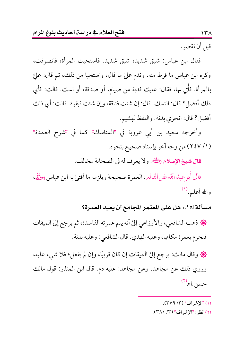 مسألة [١٥]: هل على المعتمر المجامع أن يعيد العمرة؟