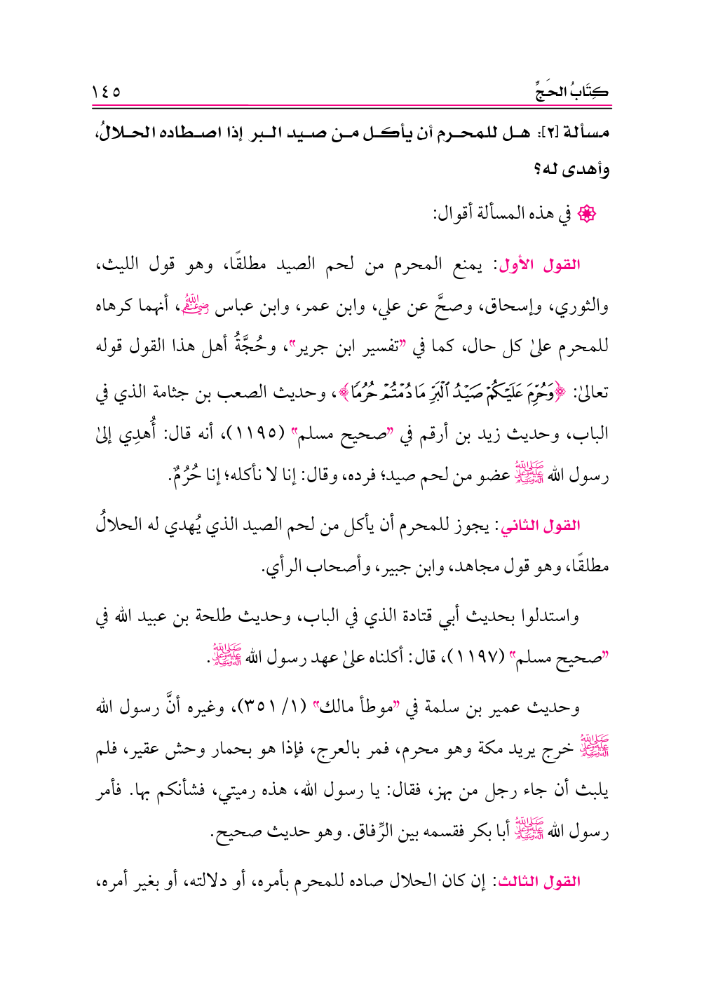 القول الأول: يمنع المحرم من لحم الصيد مطلقًا، وهو قول الليث، والثوري، وإسحاق، وصحَّ عن علي، وابن عمر، وابن عباس -رضي الله عنهم-، أنهما كرهاه للمحرم على كل حال، كما في «تفسير ابن جرير»، وحُجَّةُ أهل هذا القول قوله تعالى: {وَحُرِّمَ عَلَيْكُمْ صَيْدُ الْبَرِّ مَا دُمْتُمْ حُرُمًا}، وحديث الصعب بن جثامة الذي في الباب، وحديث زيد بن أرقم في «صحيح مسلم» (١١٩٥)، أنه قال: أُهدِي إلى رسول الله -صلى الله عليه وعلى آله وسلم- عضو من لحم صيد؛ فرده، وقال: إنا لا نأكله؛ إنا حُرُمٌ.