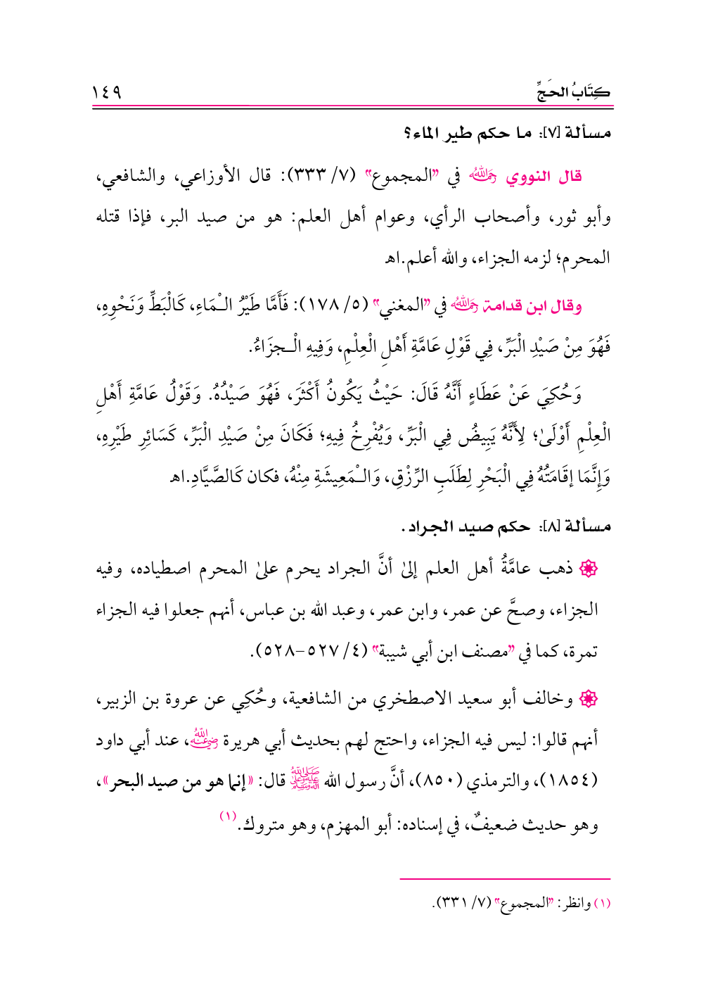 • وخالف أبو سعيد الاصطخري من الشافعية، وحُكِي عن عروة بن الزبير، أنهم قالوا: ليس فيه الجزاء، واحتج لهم بحديث أبي هريرة -رضي الله عنه-، عند أبي داود (١٨٥٤)، والترمذي (٨٥٠)، أنَّ رسول الله -صلى الله عليه وعلى آله وسلم- قال: «إنما هو من صيد البحر»، وهو حديث ضعيفٌ، في إسناده: أبو المهزم، وهو متروك. (¬١)