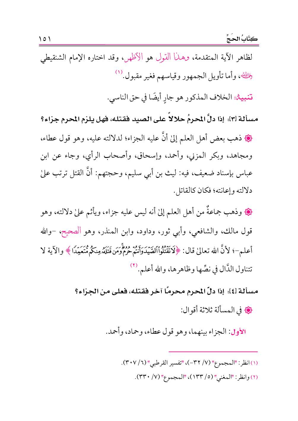 • وذهب جماعةٌ من أهل العلم إلى أنه ليس عليه جزاء، ويأثم على دلالته، وهو قول مالك، والشافعي، وأبي ثور، وداود، وابن المنذر، وهو الصحيح، -والله أعلم-؛ لأنَّ الله تعالى قال: {لَا تَقْتُلُوا الصَّيْدَ وَأَنْتُمْ حُرُمٌ وَمَنْ قَتَلَهُ مِنْكُمْ مُتَعَمِّدًا} والآية لا تتناول الدَّال في نصِّها وظاهرها، والله أعلم. (¬٢)