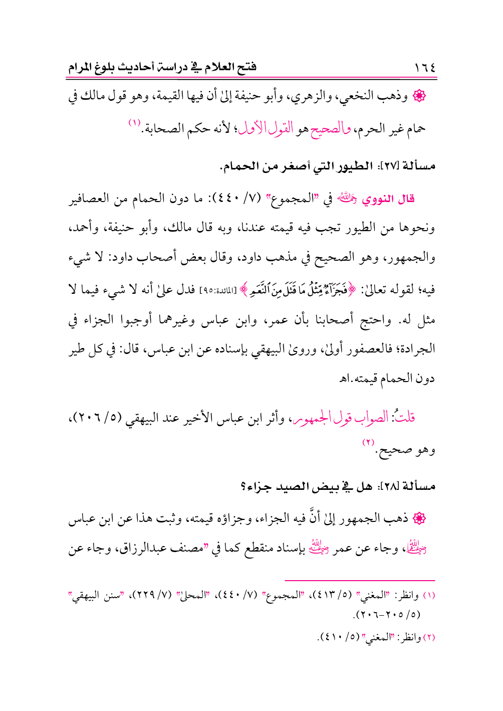 • وذهب النخعي، والزهري، وأبو حنيفة إلى أن فيها القيمة، وهو قول مالك في حمام غير الحرم، والصحيح هو القول الأول؛ لأنه حكم الصحابة. (¬١)