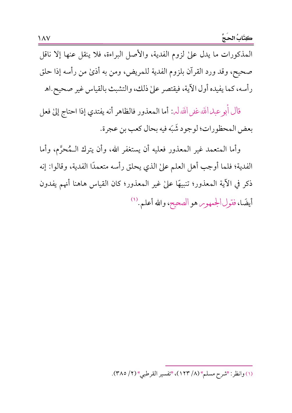 وأما المتعمد غير المعذور فعليه أن يستغفر الله، وأن يترك المُحرَّم، وأما الفدية؛ فلما أوجب أهل العلم على الذي يحلق رأسه متعمدًا الفدية، وقالوا: إنه ذكر في الآية المعذور؛ تنبيهًا على غير المعذور؛ كان القياس هاهنا أنهم يفدون أيضًا، فقول الجمهور هو الصحيح، والله أعلم. (¬١)