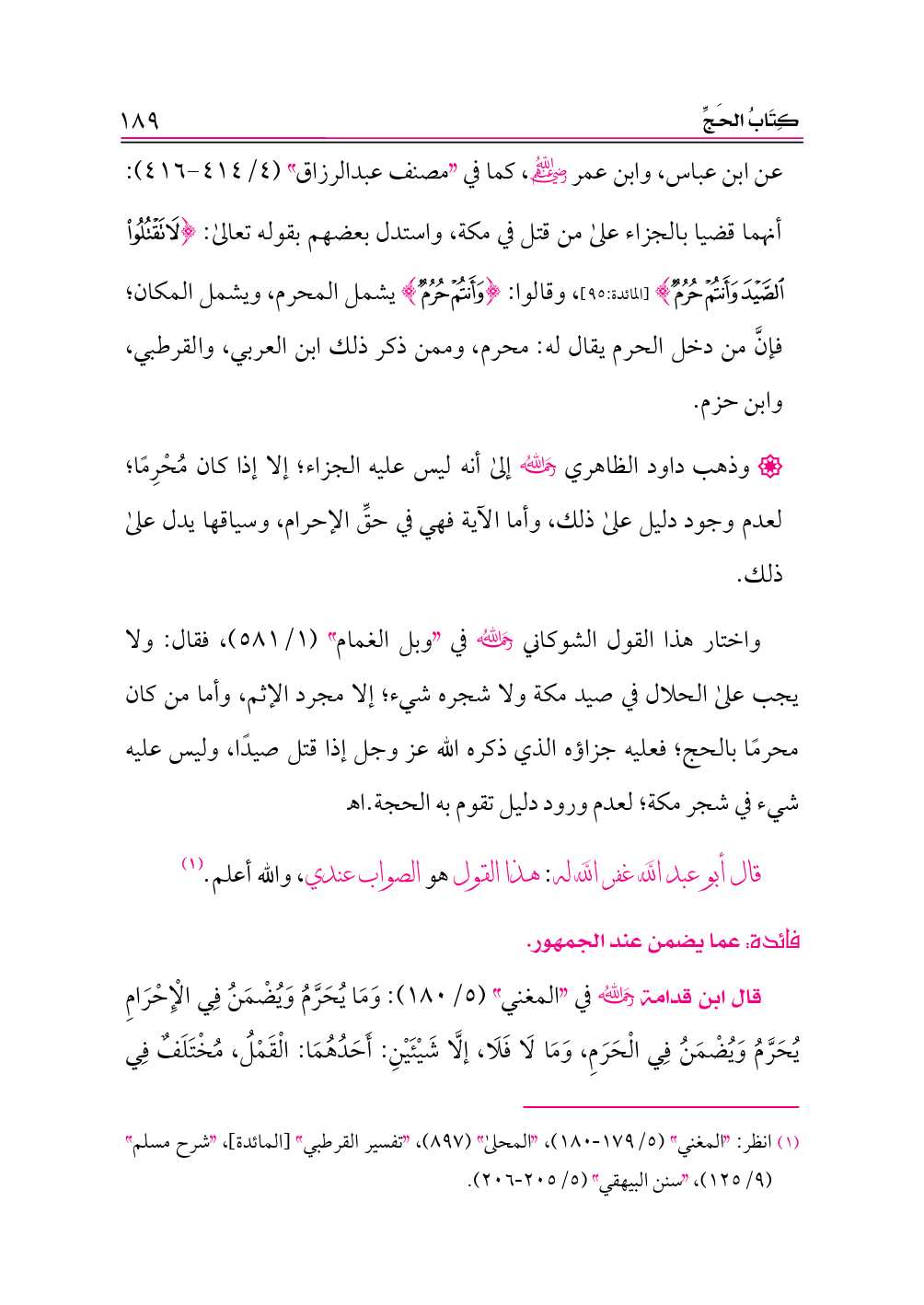 عن ابن عباس، وابن عمر -رضي الله عنهم-، كما في «مصنف عبدالرزاق» (٤/ ٤١٤ - ٤١٦): أنهما قضيا بالجزاء على من قتل في مكة، واستدل بعضهم بقوله تعالى: {لَا تَقْتُلُوا الصَّيْدَ وَأَنْتُمْ حُرُمٌ} [المائدة:٩٥]، وقالوا: {وَأَنْتُمْ حُرُمٌ} يشمل المحرم، ويشمل المكان؛ فإنَّ من دخل الحرم يقال له: محرم، وممن ذكر ذلك ابن العربي، والقرطبي، وابن حزم.